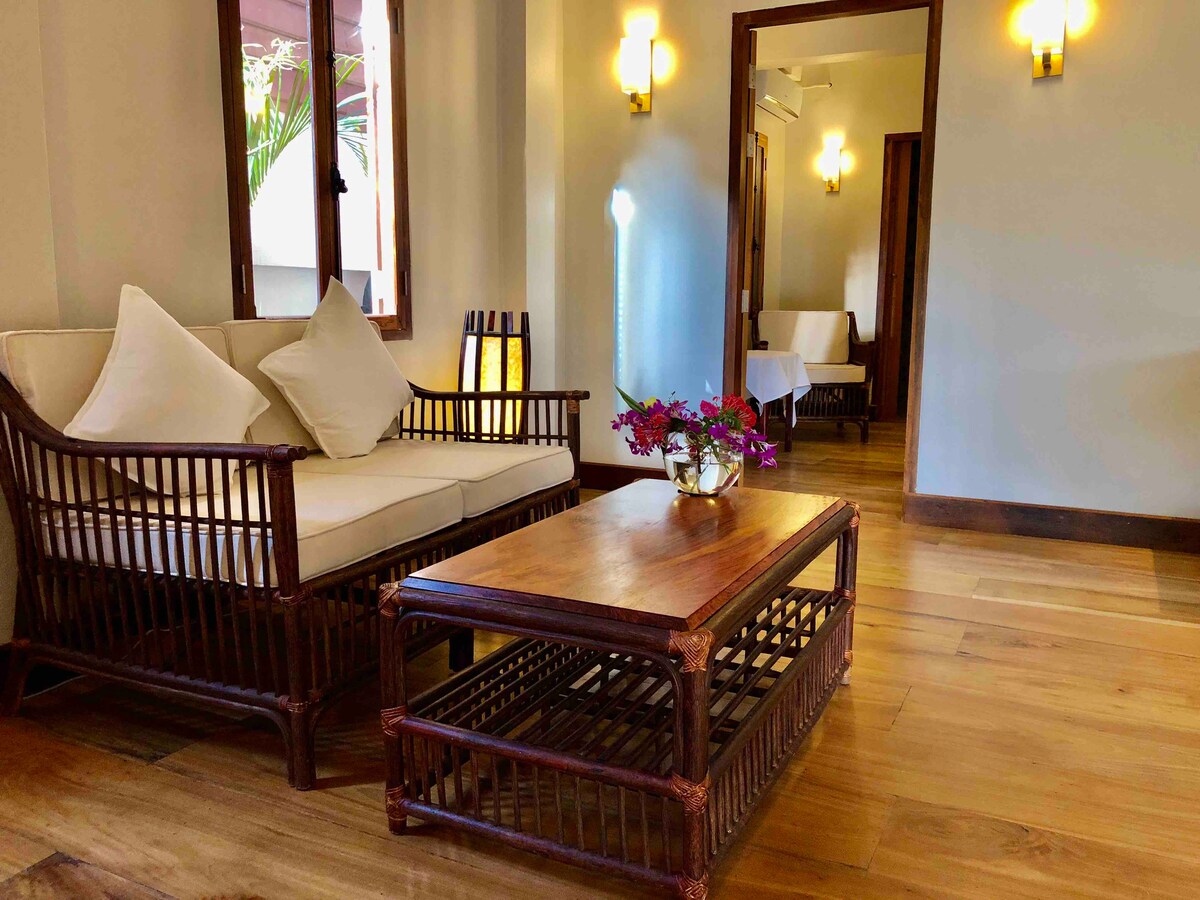 70 sqm covering the ground floor of our fully renovated Peninsula House. Private access. The outdoor terrace with comfortable seats and looks onto a small front garden. Airy livingroom with a small American kitchen. The bedroom has a comfortable King Size bed, and a lot of window, Good bathroom with window and rain shower. We are in the prime situation of Luang Prabang's Old Town, at the tip of the Peninsula, only 100m from the Mekong river. Splendid Wat Xiengthong is right next door.