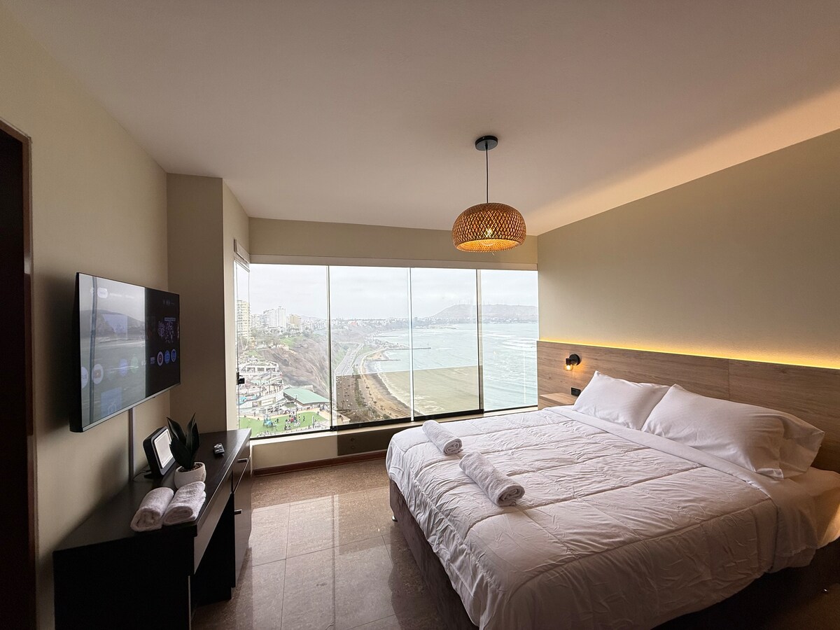 New apartment located 1 minute from Larcomar mall overlooking the Pacific Ocean where you will find restaurants and entertainment places. Only 10 minutes walk to Kennedy Park in Miraflores. Perfect for couples and business travelers. Nuevo apartamento a 1 minuto del C.C Larcomar con vista al Océano Pacífico,donde encontrarás restaurantes y lugares de entretenimiento. A solo 10 minutos caminando al Parque Kennedy. Perfecto para parejas y viajeros de negocios.