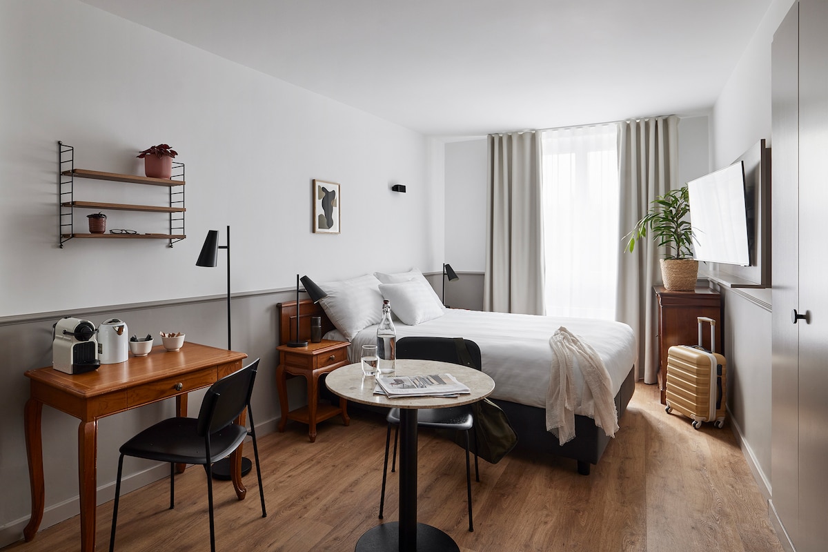 Alojamientos modernos con cocina totalmente equipada (horno/microondas, placas de inducción de cuatro anillos, nevera/congelador, lavavajillas, cafetera Nespresso y todo el equipo de cocina, incluidos utensilios), sala de estar con mesa de comedor, cama tamaño queen (160x200 cm), sofá para relajarse, se puede convertir en un sofá cama, un televisor de Internet HDTV de 40 pulgadas, wifi gratuito, espacio de almacenamiento prolongado para ropa y bolsas, baño privado con productos de belleza naturales y orgánicos y secador de pelo. Plancha, tabla de planchar y caja fuerte.
