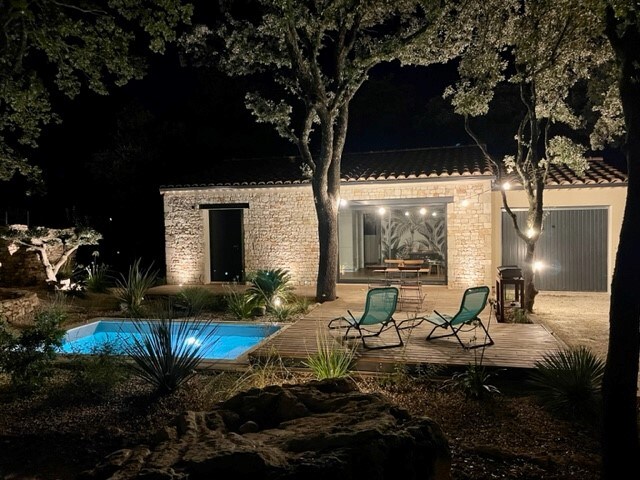 Meublé de tourisme classé 4 * : 65m2 dans écrin de verdure. La terrasse privative donne sur une forêt de chênes et de pins avec vue sur les collines. Une chambre avec un grand lit (qualité hotellerie) et une salle de bain attenante + une cuisine ouverte toute équipée et donnant sur un salon avec 2 banquettes-lits simples. Équipement complet, piscine partagée avec les propriétaires Nous serons ravis d’échanger sur les bonnes adresses de la région si les voyageurs le souhaitent.