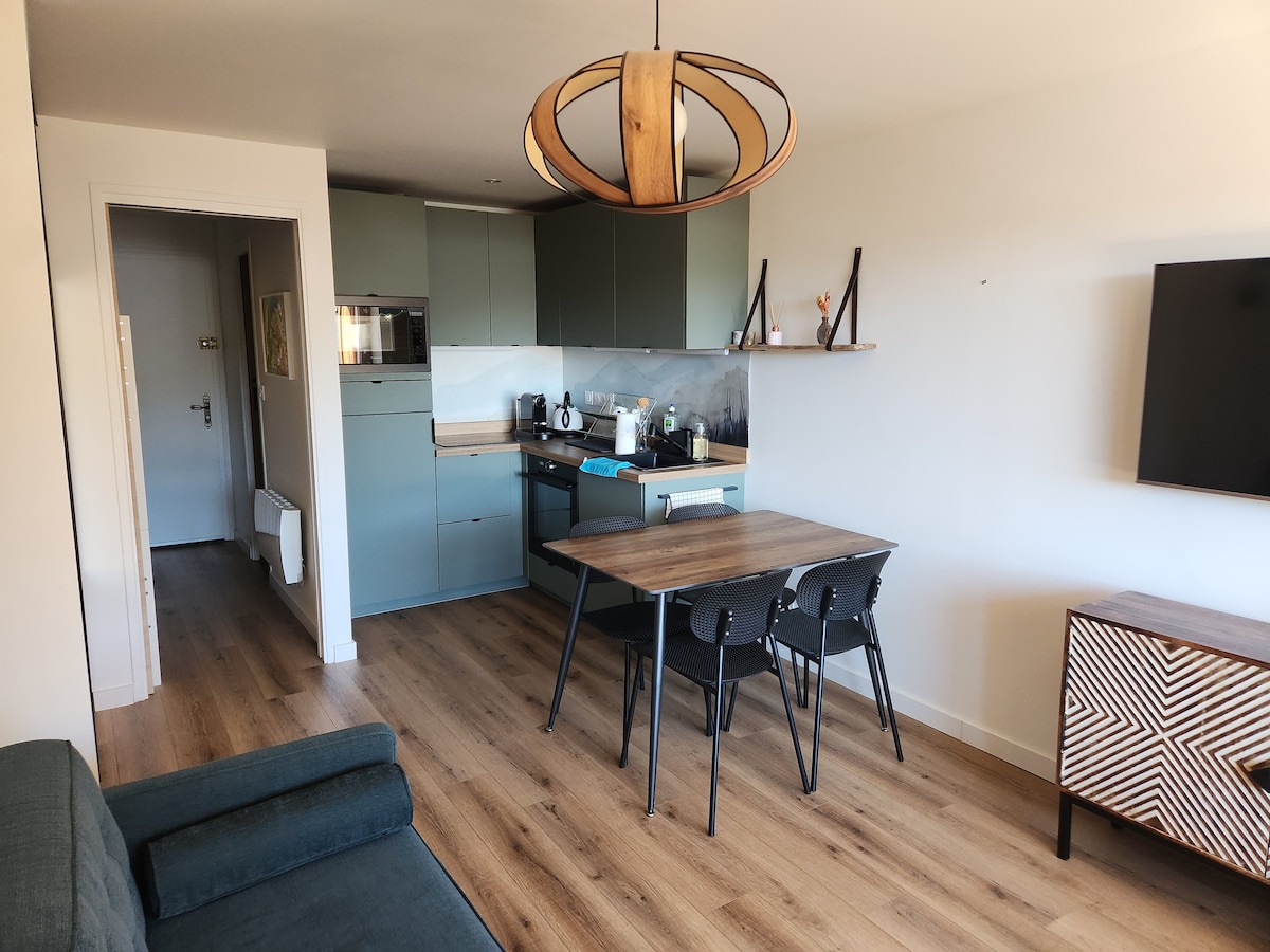 Gran estudio** acogedor de 30 m2 con balcón para 2 a 4 personas (ideal para 2 adultos y 2 niños) en el primer piso de una residencia en el centro del pueblo. Cerca de las tiendas y de todas las actividades. internet WIFI - APARCAMIENTO PRIVADO a menos de 5 minutos a pie del alojamiento ( excepto durante la copa del mundo de biatlón). Orientación sur con vistas a la cadena de los Aravis.