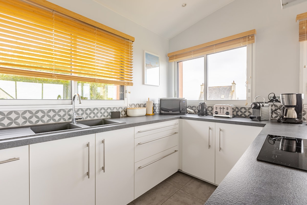 Luminosa y espaciosa, cerca de las tiendas de proximidad, esta casa te encantará para tus vacaciones. Situada en una zona tranquila con jardín, en un pequeño pueblo costero, a las puertas de Douarnenez, podrá caminar por el sendero costero GR34 y descubrir nuestros hermosos lugares y patrimonio. Pointe du Raz, Quimper, Guilvinec, Locronan, Pointe du Millet, Presqu'ile de Crozon, etc. y, por supuesto, disfrutar de las playas y los deportes acuáticos.