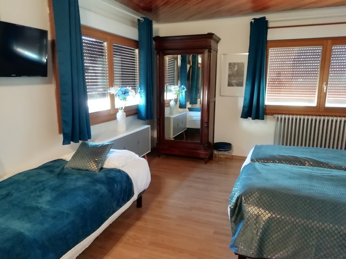 Encantador chalet independiente de 2 a 4 personas de 45 m2. Ambiente de bienestar asegurado con: - 1 habitación (cama de 140 x 190) - 1 gran cuarto de baño - 1 amplia sala de estar con sofá cama con colchón de 140, cocina equipada (placa de inducción, horno, microondas, lavavajillas,...) - aparato de raclette y fondue, crepera - TV , wifi gratuito - parking - calefacción con estufa de pellets - Se proporcionan sábanas y toallas