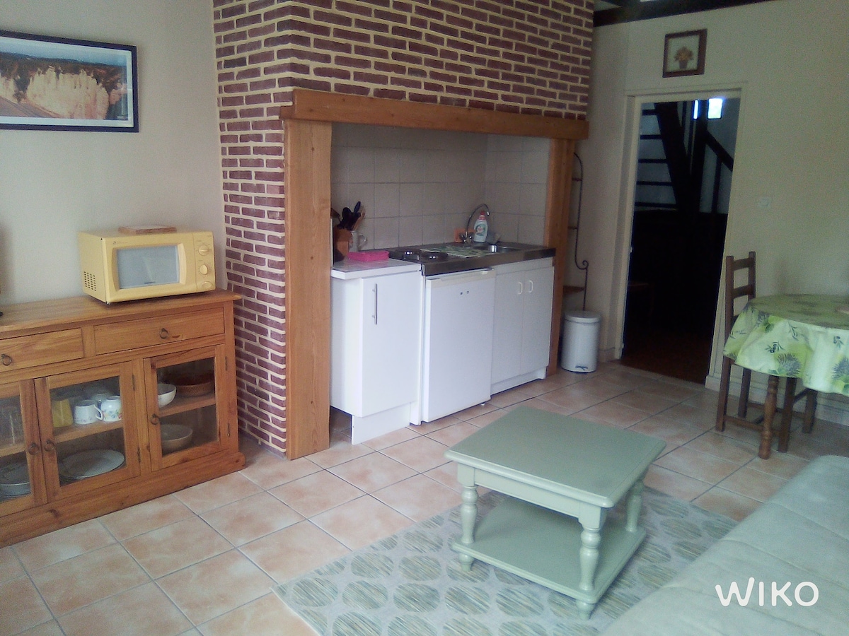 Casita adosada a la vivienda de los anfitriones. Un verdadero remanso de paz en una zona verde idealmente situado a las puertas de Etretat (a 20 minutos a pie o a 3 minutos en coche). Este alojamiento tiene un espacio privado sin vecinos con terraza con vistas al huerto, una sala de estar con 1 sofá cama para 2 personas, una cocina equipada, un baño con ducha e inodoro, un dormitorio en el ático de arriba con 2 camas individuales. Capacidad para entre 1 y 4 personas.