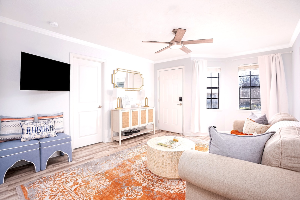 Newly revamped with new management! (September 2025) Fresh linens, new decorations, a new kitchen and bath setup - we have it all! Your essentials, from a hairdryer, soft linens, patio are all right here and all one level. Ample parking for 2 cars, communal pool, & a pet-friendly approach with fee. Conveniently use Auburn’s Tiger Transit - the free bus system shuttles you between the complex &campus. 0.4 miles to Veterinary School 2.7 miles from Auburn University Campus
