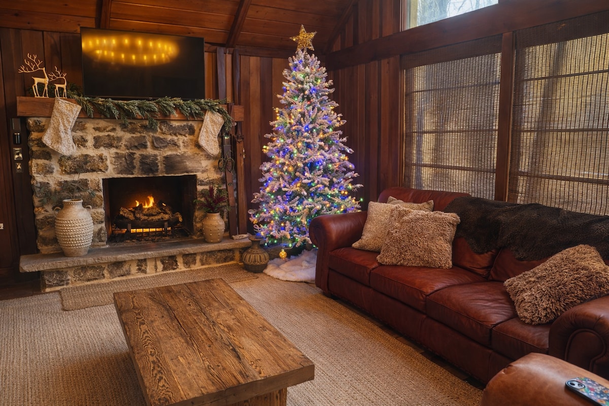 To make your holiday stay even more memorable, the home is decorated for the season with festive accents and a beautifully styled Christmas tree. Escape to this cozy A-frame chalet in Big Bass Lake, perfect for snowy retreats. Warm up in the private barrel sauna, unwind by indoor fireplaces, or enjoy the game room with air hockey, foosball, and 75" Smart TV. Relax by the firepit under twinkle lights, or visit the indoor community pool just 0.4 miles away.