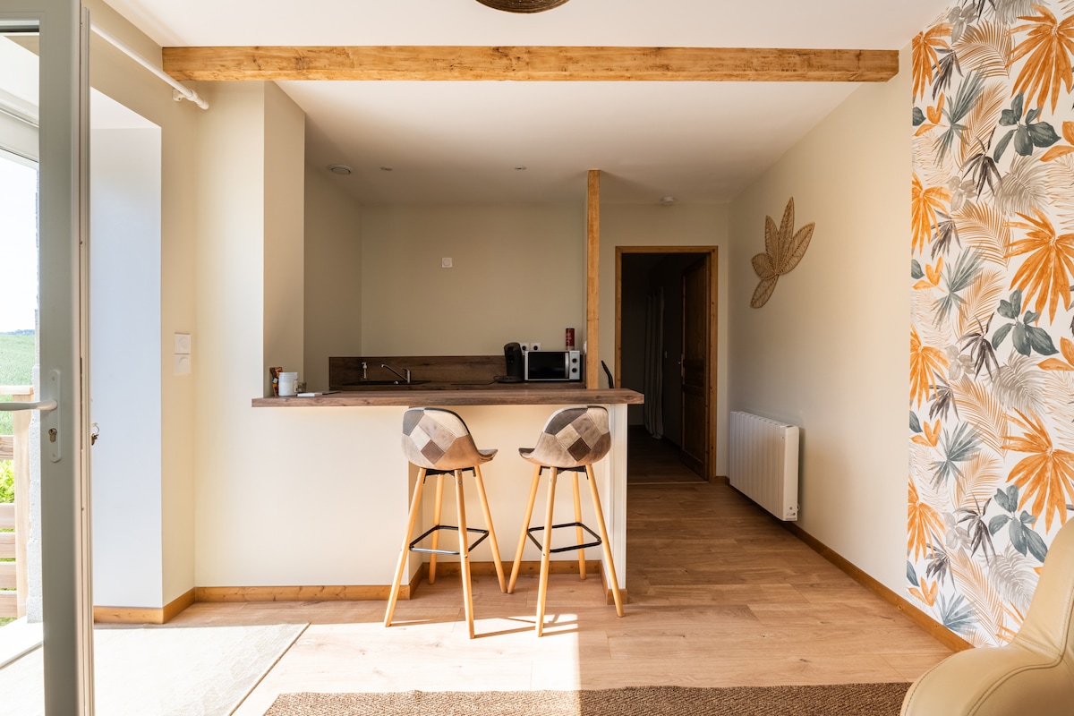 Estudio de 30 m², nuevo, entrada independiente, tranquilo con zona de jardín privado. Rutas de senderismo al pie de la casa y muchos puntos de interés turístico cerca. En pleno campo, sin vecinos, el despertar está asegurado por el canto de los pájaros. ¡Con un poco de suerte podrá presenciar magníficas puestas de sol! Tenemos un gallo y ocas... Panadería, farmacia y restaurantes a 8 minutos y supermercado a 10 minutos.