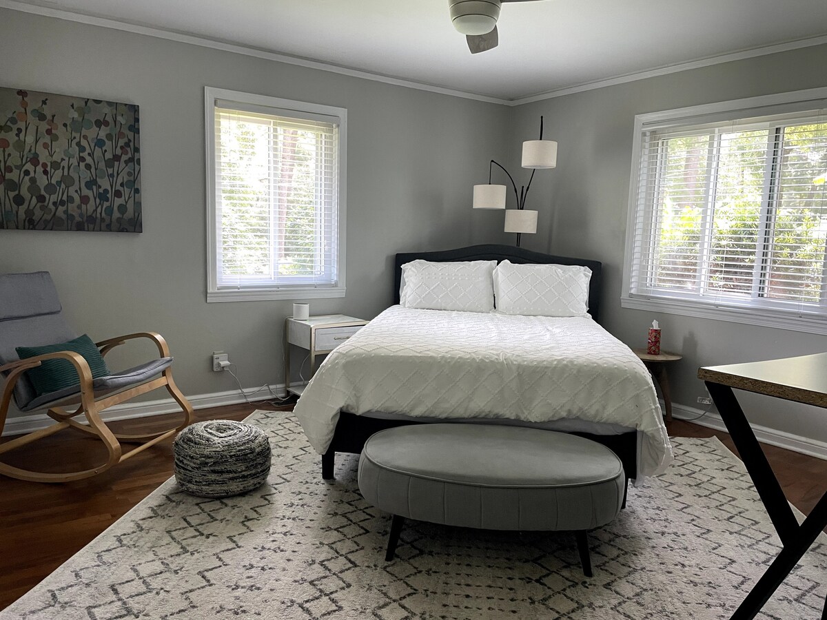 Lovely and completely renovated 1100 sqft in-law suite, fully self contained and private. It comes complete with a fully equipped kitchen (no commercial food preparation allowed) and bathroom with walk-in shower. Queen size bed in the bedroom, with a Queen size sleeper sofa in the living room. Has its own private entrances and dedicated driveway parking area, as well as self-check-in. No pets allowed. This is a strict non-smoking space, no smoking is allowed on the property.