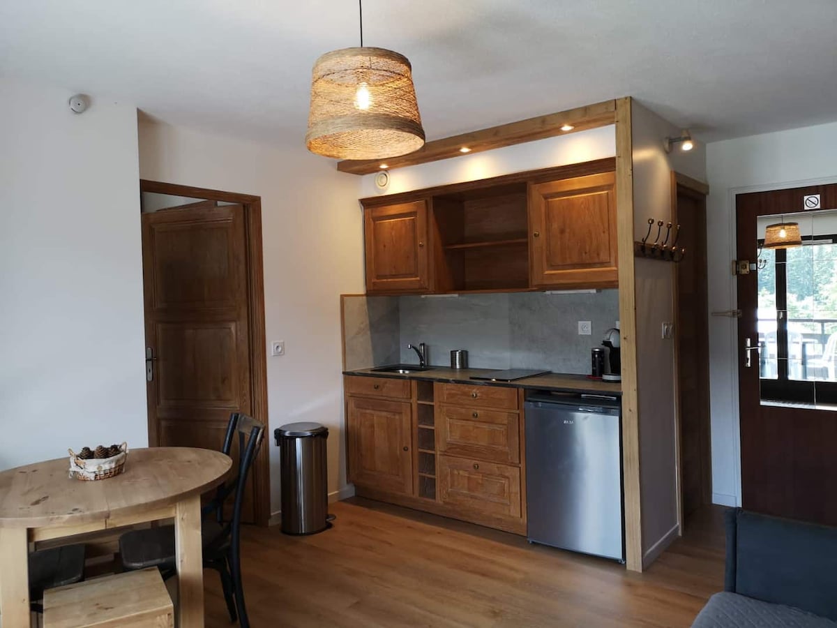 Amplio alojamiento decorado con cuidado con una gran sala de estar y una cocina totalmente equipada.. el dormitorio es una suite con ducha y una cama grande (160x200) . Hay un jardín con una pequeña terraza privada, así como aparcamiento privado. La cabaña está cerca de restaurantes, actividades adecuadas (pistas de esquí y alpino, ruta de senderismo y ciclismo de montaña).. perfecto para parejas, viajeros solos, viajeros de negocios.. PERO SOLO 2 PERSONAS (no hay bebé 👶)