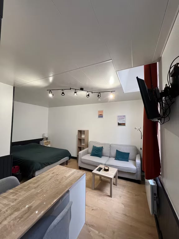 Nuestro estudio de 24 m2, se encuentra en el centro de Rochefort, a 10 minutos a pie de los baños termales, a pocos metros de la plaza Colbert y de la Corderie Royale. En la planta baja, muy tranquilo, aunque el estudio da a la calle. Consta de cocina, placas de inducción, tostadora, hervidor de agua, Nespresso, nevera con compartimento congelador separado. La cama (160 x 200) está separada del resto de la habitación por una mampara decorativa. Tenga en cuenta que no hay lavavajillas.