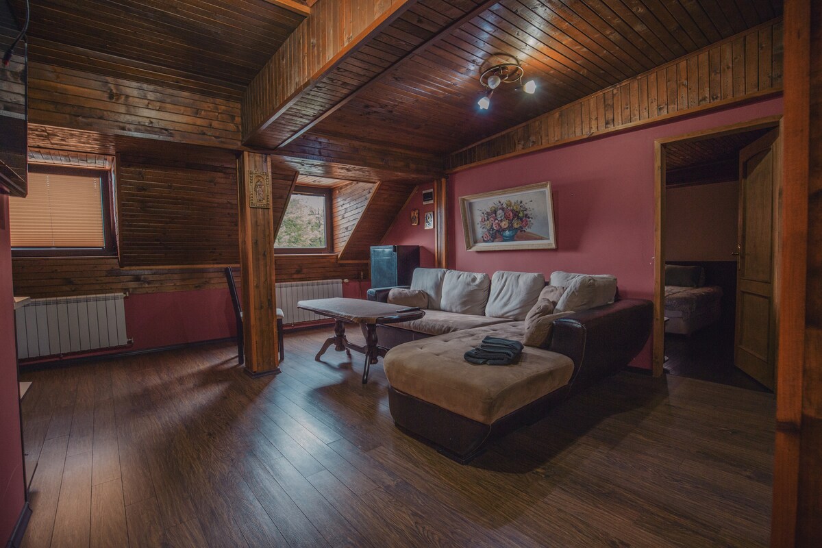 Disfruta de una escapada tranquila en nuestra encantadora casa de madera rodeada de bosque en Balyovtsi, Bulgaria. La casa tiene capacidad para 4 huéspedes y ofrece 2 dormitorios, una cocina totalmente equipada y una luminosa sala de estar con grandes ventanales que dan al jardín. A poca distancia en auto de Sofía, esta casa es perfecta para parejas, familias o cualquier persona que busque relajarse en la naturaleza. ¡Esperamos tu visita!