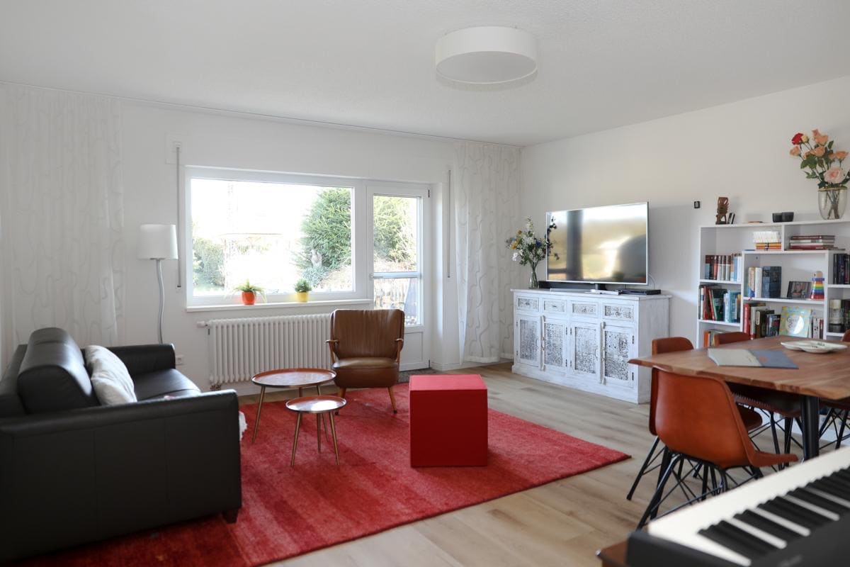 Nuestro luminoso apartamento ático de 3 habitaciones está situado en una zona rural, pero ofrece varias oportunidades de compra a 2-5 minutos a pie. La frontera suiza está a solo 5 minutos en coche del apartamento. El apartamento ofrece 2 dormitorios y una gran sala de estar, comedor y cocina. El apartamento tiene su propio balcón, así como una hermosa vista desde el tragaluz. Incluye aparcamiento gratuito, lavadora e internet rápido. Además, ofrecemos a nuestros huéspedes acceso gratuito a Netflix, Amazon Prime Video y Disney+.
