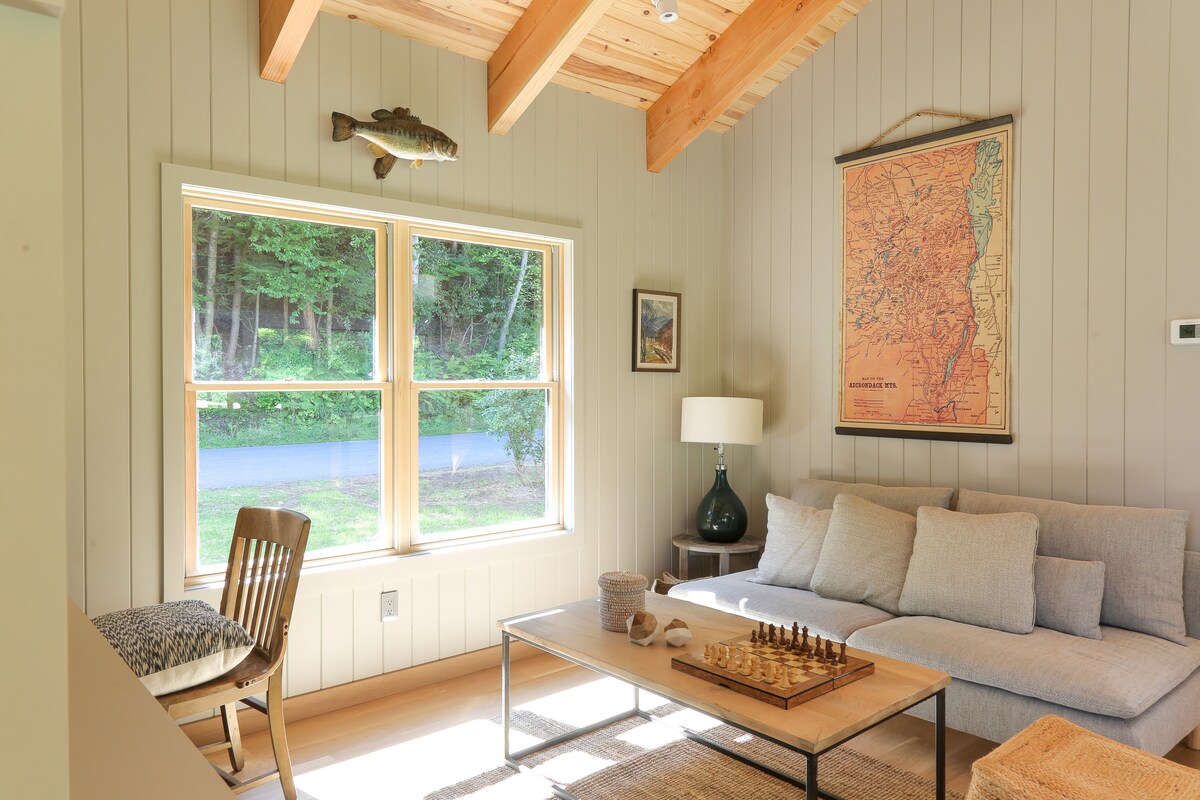 Newly built riverside cabin overlooking 600ft of private riverfront right on the edge of Livingston Manor. The cabin soaring ceilings and large windows create a light filled space and big views onto the Willowemoc river - stroll down the bank to fly fish one of the areas most famous rivers, or just enjoy looking out over it from your own private deck. After sunset enjoy the outdoor firepit, or indoor stone clad fireplace, or cook a feast from the chef's kitchen.