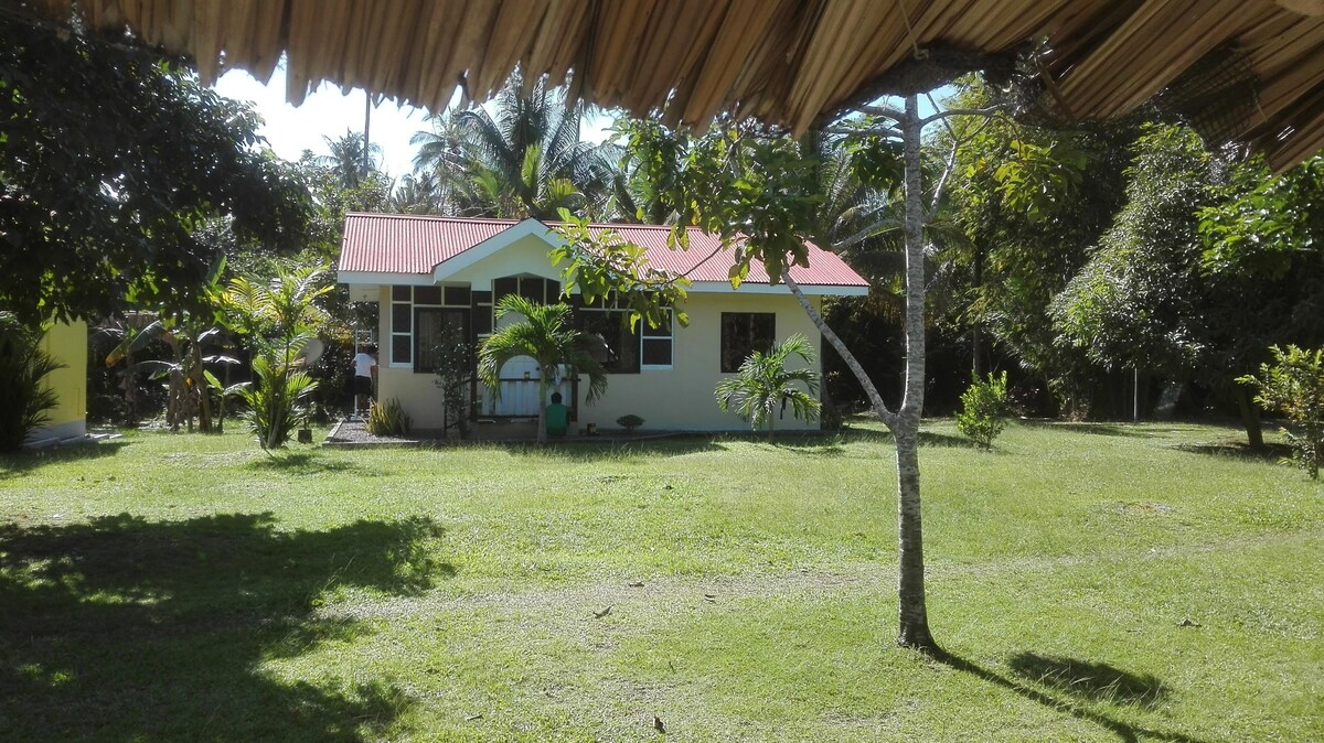 Disfruta de una estancia en una casa bungalow dentro de una zona de 350 metros cuadrados, con una sala interior y exterior, y una cabaña nativa encima. La zona está rodeada de un jardín para un ambiente de vegetación. Las mascotas son muy bienvenidas y seguras para deambular por la zona. Todo en la cocina está completo, incluida una parrilla para barbacoa. El agua potable limpia se proporciona con dispensador de agua. Se pueden proporcionar aperitivos si están disponibles. El wifi cuenta con televisores inteligentes y hay una máquina de karaoke disponible para disfrutar con tus amigos y familiares.