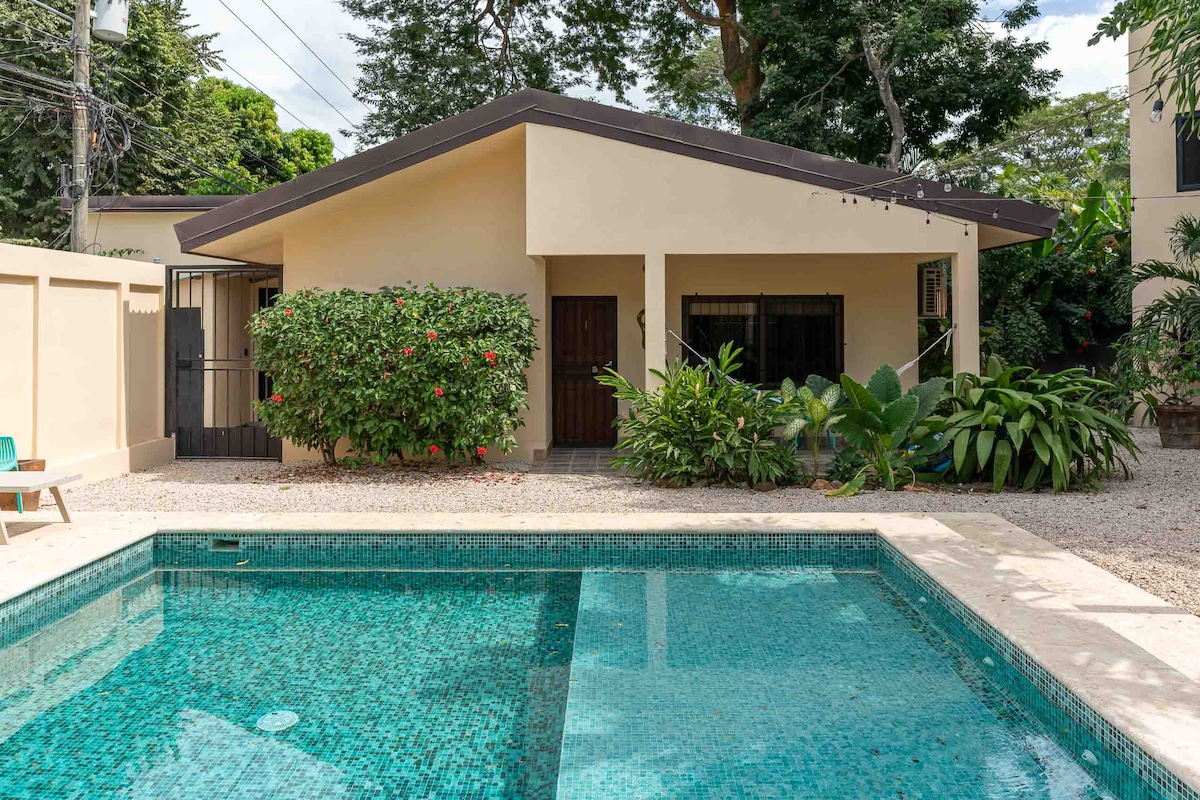 Apartamento equipado con todo lo que necesitas para corto o largo plazo de estadía. Internet rápido, ubicado en una rotonda residencial tranquila donde casi no circulan autos. A 300 metros de la playa, restaurantes, banco, supermercado, 100 metros del gym super céntrico. Puedes salir en la noche y volver caminando. Es normal ver en el patio, iguanas, monos aulladores, zorritos, Aves, ardillas etc. Los huespedes tiene descuentos en el surf shop Club 33 y además te ayudare a recomendarte otras act