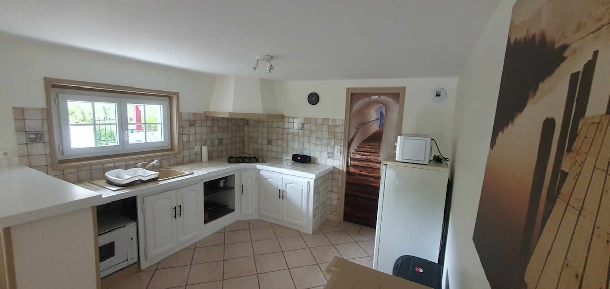 Alojamiento situado en la planta baja de la casa de los propietarios que consta de 3 dormitorios(2 dormitorios con 1 cama doble y 1 dormitorio con 2 camas individuales).Posibilidad de cuna. Una cocina equipada (vitrocerámica de gas, horno, nevera, Senseo, lavavajillas) Salón/Sala de estar completan el conjunto donde encontrará juegos de mesa para jugar en familia o con amigos. En el exterior, podrá disfrutar de los muebles de jardín mientras escucha el relajante ruido del Saison, y la piscina familiar climatizada.