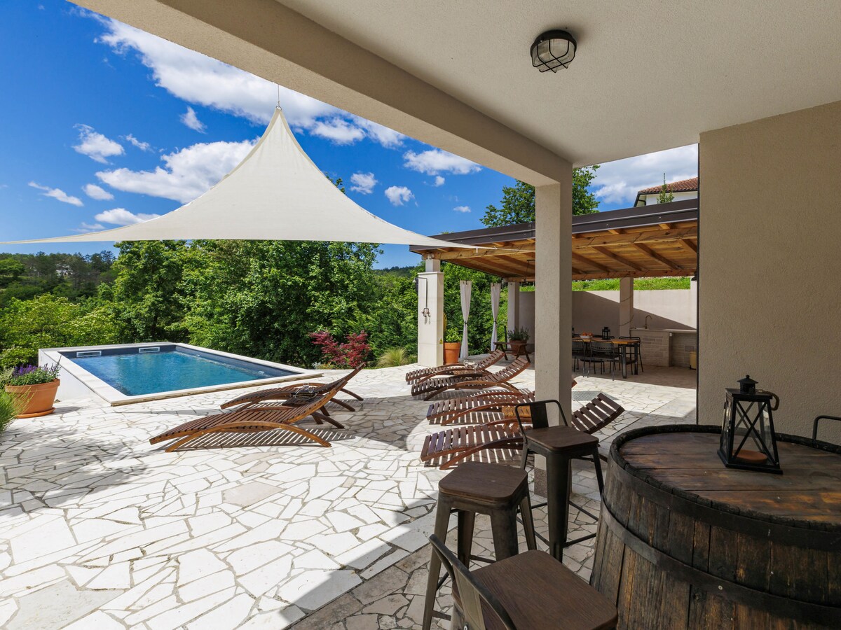 Novouređeni apartman u malom mjestu iznad Lovrana udaljen samo 5 km od centra, plaža i šetnice Lungomare. Kuhinja je potpuno opremljena za kuhanje,a svako ćete jutro moći uživati i u kavi iz modernog Phillips aparata na velikoj vanjskoj terasi ili balkonu s pogledom na more.Sve sobe su opremljene kvalitetnim Boxspring krevetima i TV-om. Odmarajte uz bazen 7,5 x 3,70 m namijenjen isključivo vama dok se djeca zabavljaju na trampolinu,ljuljačkama ili Nintendo konzoli. Veselimo se vašem dolasku.