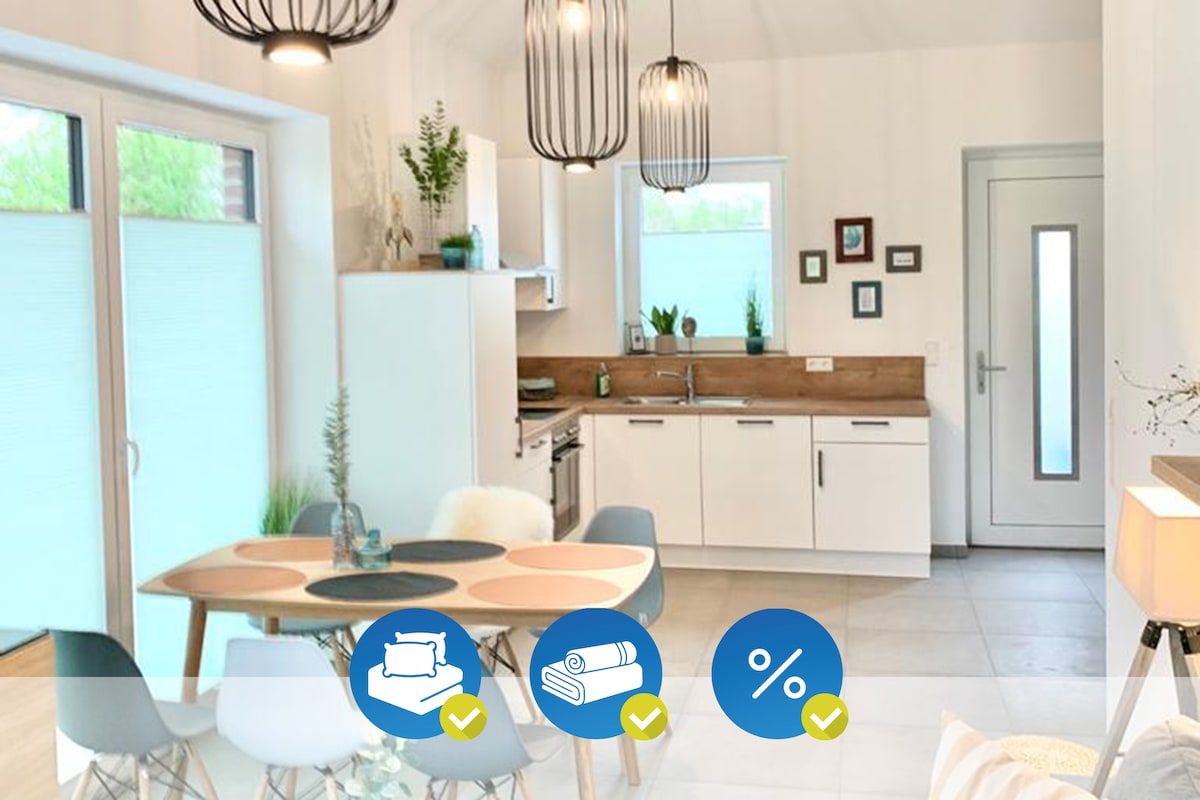 Our tastefully renovated bungalow was completely refurbished by ourselves. A cozy sofa, a lovely seating area in the open kitchen, and two bedrooms with 1.60m beds make this house a wonderful accommodation. A spacious bathroom and a guest toilet are available. The kitchen is fully equipped, including a coffee machine. A small garden invites you to relax (currently still in progress). Hospital, bus and train stations, dining options, and shopping facilities are nearby.