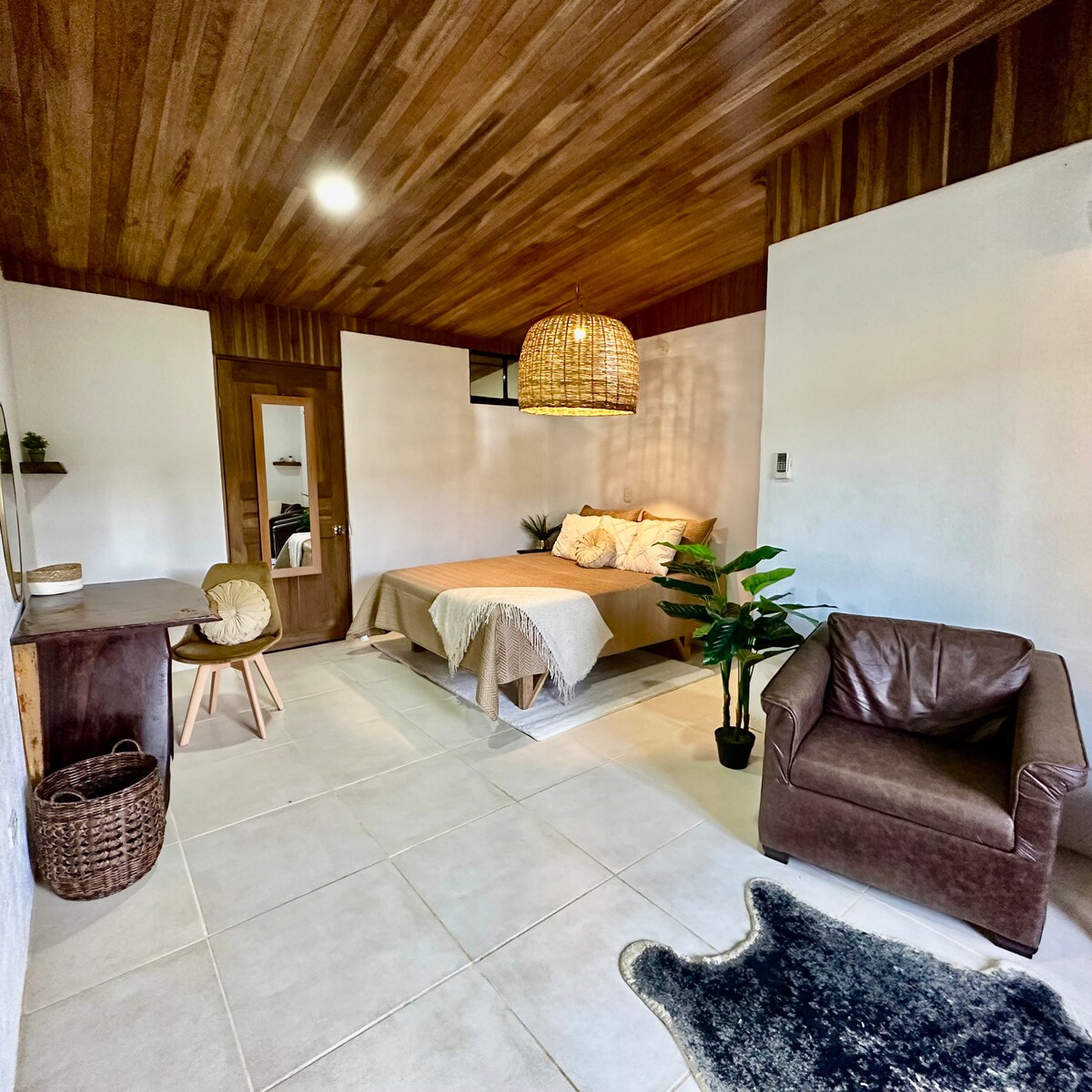 Será un placer volver a casa después de un día de playa a este tranquilo y espacioso apartamento. Te encantará despertarte con el sonido de los monos aulladores y los pájaros. Disfruta de un café en el porche delantero mientras contemplas los hermosos jardines. Es posible que veas un grupo de monos aulladores o capuchinos, o tal vez incluso un perezoso. A menudo se puede escuchar el sonido del océano. Tenemos docenas de árboles frutales y una bandada de patos que deambulan por la propiedad. Si lo deseas, estaremos encantados de ofrecerte un recorrido por nuestra pequeña granja.