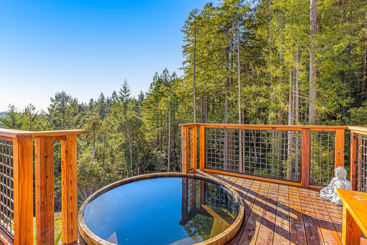 Escápate a la privacidad de la Mendocino Tree House, un refugio octogonal construido alrededor de un árbol de secuoya de 80 años con un spa al aire libre de lujo completo. La casa de 2 dormitorios y 2 baños combina el estilo moderno con el esplendor natural. Relájate en la amplia terraza envolvente o relájate junto a la fogata en medio de las secuoyas. Disfruta bajo las estrellas en el oasis de spa al aire libre, con jacuzzi, sauna de leña, bañera con patas y ducha. Sumérgete en la comodidad, donde cada detalle te invita a abrazar la paz y la serenidad.