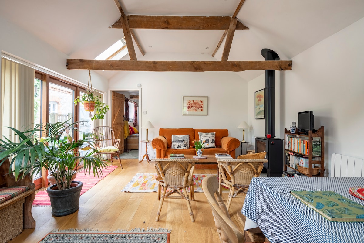 Granero rústico reconvertido junto a la casa principal. Acceso por camino de grava. Edificio privado con jardín compartido. Luminoso y espacioso, con ventanas francesas y luces en el techo. Vigas originales expuestas. 2 habitaciones más ducha/inodoro privado. Especifica si prefieres una cama tamaño king o dos camas individuales al hacer la reserva. Situado en un pueblo tranquilo con fácil acceso a Bury St Edmunds, Newmarket, Cambridge, Norwich y la costa. Anfitriones amables, pollos, perros y gatos en la propiedad y suministro de huevos frescos. ¡Swallow Barn es el paraíso de un escritor!