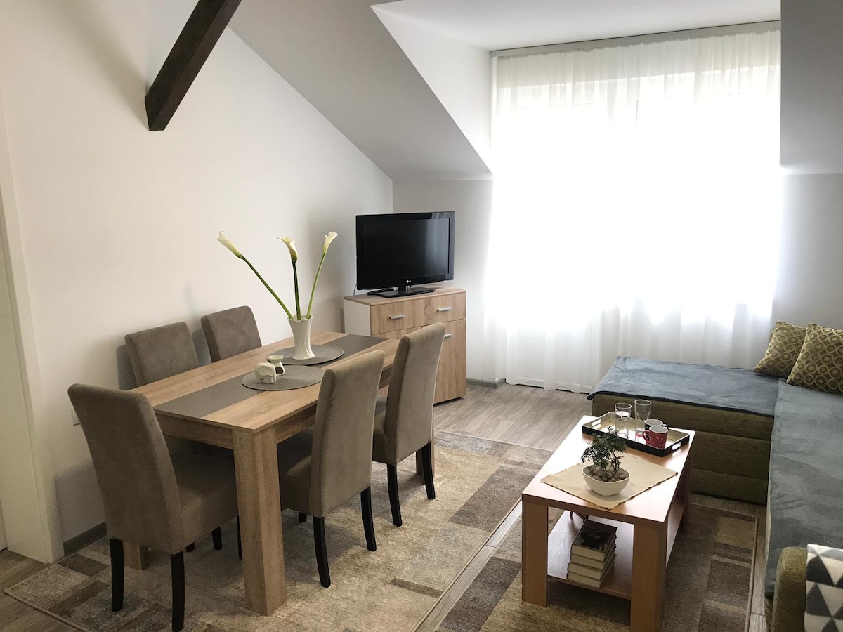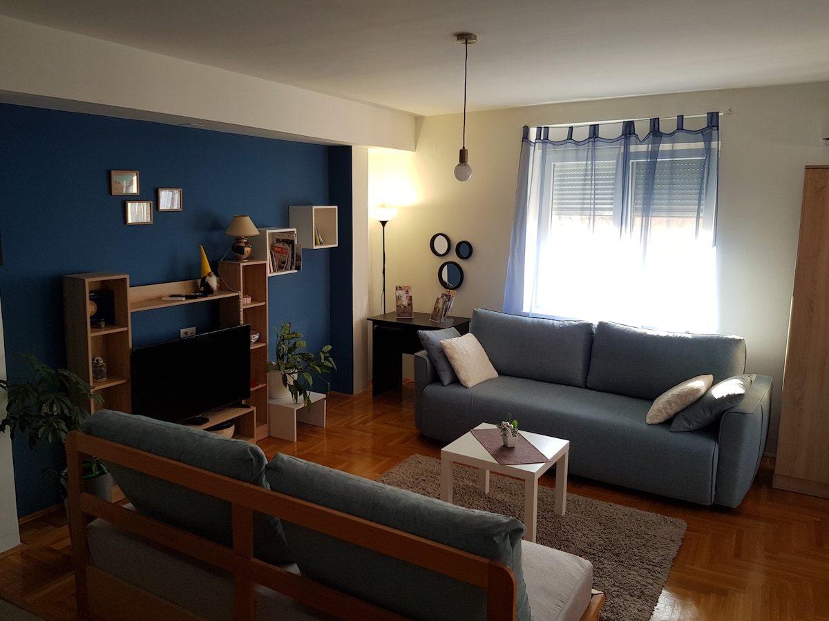 Apartamento totalmente equipado a poca distancia a pie del centro de la ciudad. El apartamento está situado enfrente del mercado de agricultores, donde puedes obtener ingredientes locales frescos (frutas, verduras, productos lácteos, carne). El centro de la ciudad está a 5 minutos a pie. Si disfrutas de la naturaleza, el parque Dudova Suma también se encuentra a 6 minutos. Los huéspedes podrán acceder al apartamento completo. Dos dormitorios, baño, cocina totalmente equipada y salón. El apartamento cuenta con wifi gratuito y TV por cable.