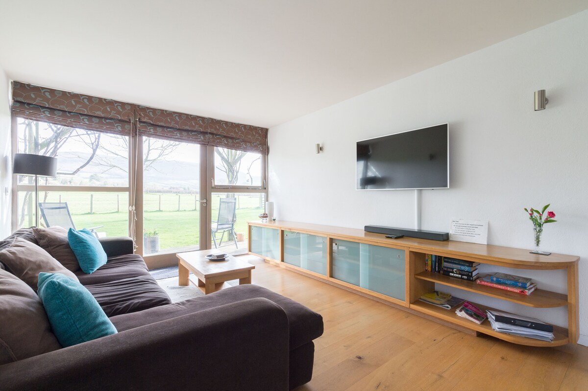 Una gran casa con un magnífico espacio de entretenimiento, ventanales del suelo al techo con vistas a las montañas, situada en el extremo del pueblo de Llangorse, en los Brecon Beacons, cerca del impresionante lago Llangorse. Ideal para grupos de amigos o familias. El pueblo es un centro de actividades al aire libre con dos excelentes pubs a un paso de distancia. La casa tiene un gran jacuzzi al aire libre, jardín privado cerrado con patio y barbacoa y amplio estacionamiento. Panel solar de 9 kWh, 2 Powerwalls de Tesla y cargador de 7 kWh para vehículos eléctricos.