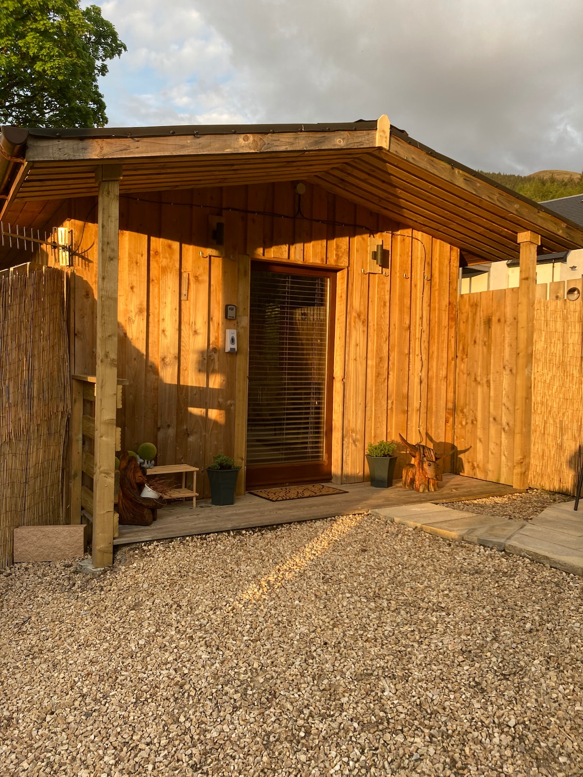 Alojamiento de lujo con baño privado y uso exclusivo del jacuzzi privado. Incluye desayuno ligero y té/café en la habitación. El refugio contemporáneo con su propia entrada privada y zona cubierta se encuentra con vistas al arroyo Allt a' Chaorach. El elegante interior incluye muebles vintage, ventanas del suelo al techo y suelos de madera reciclada. La habitación tiene una cama tamaño king, ducha a ras de suelo y nevera para bebidas. Totalmente climatizada para uso en invierno y una puerta de patio para la comodidad del verano.