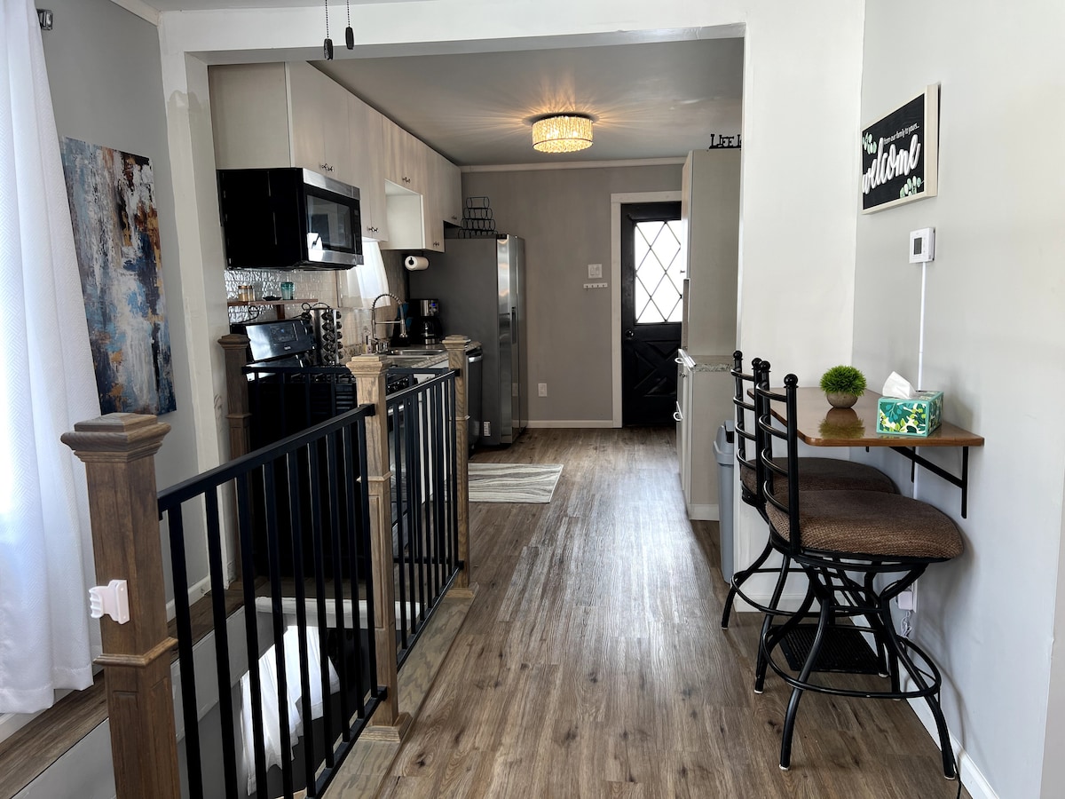 ¡Más espacioso que una suite de hotel! Arriba de una casa de 1,5 pisos que consta de 2 dormitorios, vestidor, baño y mini cocina americana, sin lavabo. Mesa de centro con elevador hasta el asiento 4. Hay un sofá cama con cama nido, así como 2 camas queen. Lo más cómodo para 4 personas. Entrada independiente y porche con pantalla delantera. Barrio tranquilo. ¡Excelente ubicación! A 1 cuadra de la calle principal y a poca distancia de senderos para bicicletas. ¡A 3 cuadras del lago Serpent! Almacenamiento de garaje para bicicletas.