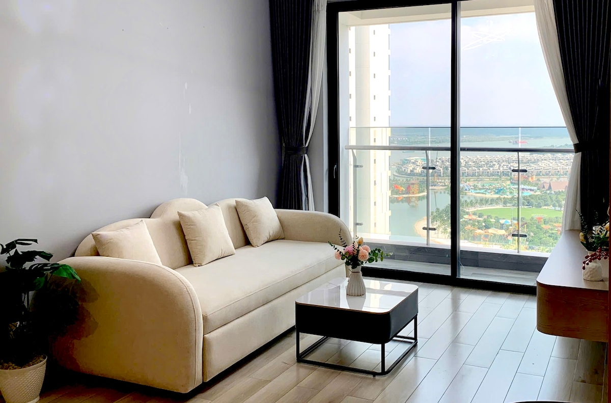 Relájese en este departamento único y tranquilo con jardín en la azotea y vistas abiertas, elevadas y con brisa, de 100 metros cuadrados y con 2 dormitorios, bañera y sauna de piedras calientes del Himalaya para aliviar los músculos y relajarse. Chatea o trabaja en línea en la mesa de té de la tarde, ideal para leer libros, beber té, café con espacio privado al aire libre, tocando el cielo azul. Disfrute de vistas despejadas al río, puestas de sol y amaneceres apacibles en Vinhomes Thu Duc.