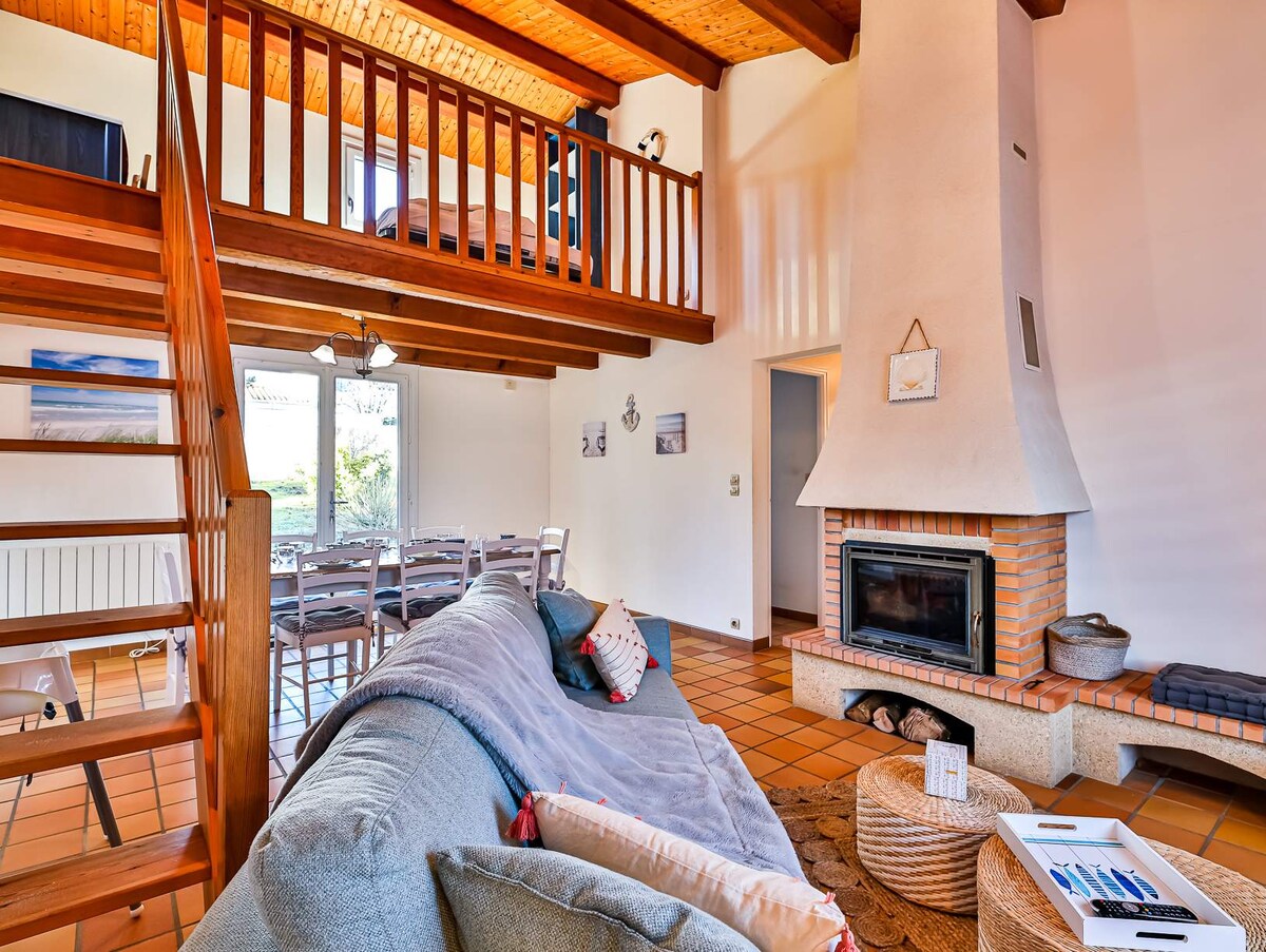 Chalet moderno y muy luminoso de madera maciza compuesto por 3 baños y una sauna. A poca distancia a pie de la villa: zona protegida forestal, acceso a la playa a 400 metros, base de actividades acuáticas y excursiones en bicicleta. ¡Ambiente acogedor garantizado! Ala Moana «Camino al mar» en hawaiano: disfruta del sonido de las olas desde un amplio jardín, con los pies en la arena. - Ch 1: cama de matrimonio + ducha doble + bañera XL. - Ch 2: cama doble + cuna. - Ch 3: cama de matrimonio + cama individual. - Entrepiso: sofá cama doble.