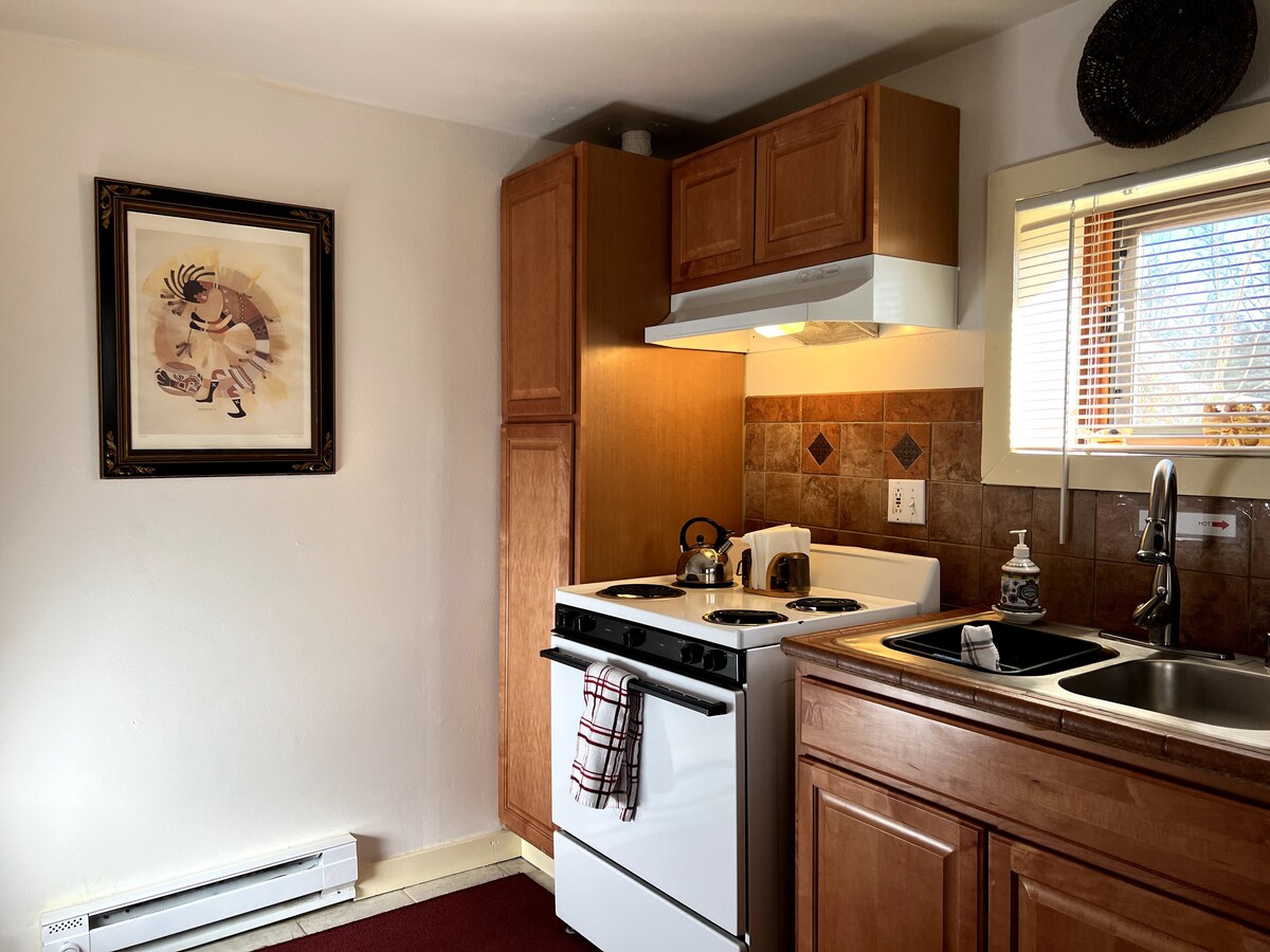 A pocos pasos de E. Palace Avenue, a 10 minutos a pie de la plaza central de Santa Fe, bienvenido a 2 Casas Martinez. Disfruta de una decoración contemporánea y limpia, entrada privada, dormitorio separado, baño con ducha grande, cocina comedor con electrodomésticos de alta gama. Las características que no encontrarás en la mayoría de las propiedades del centro incluyen: aire acondicionado; lavadora/secadora en la unidad; televisor inteligente de pantalla plana grande; Internet gratuito; ubicación tranquila y fuera de la calle; y estacionamiento gratuito fuera de la calle. Ten en cuenta que el apartamento está arriba de un tramo de escaleras.