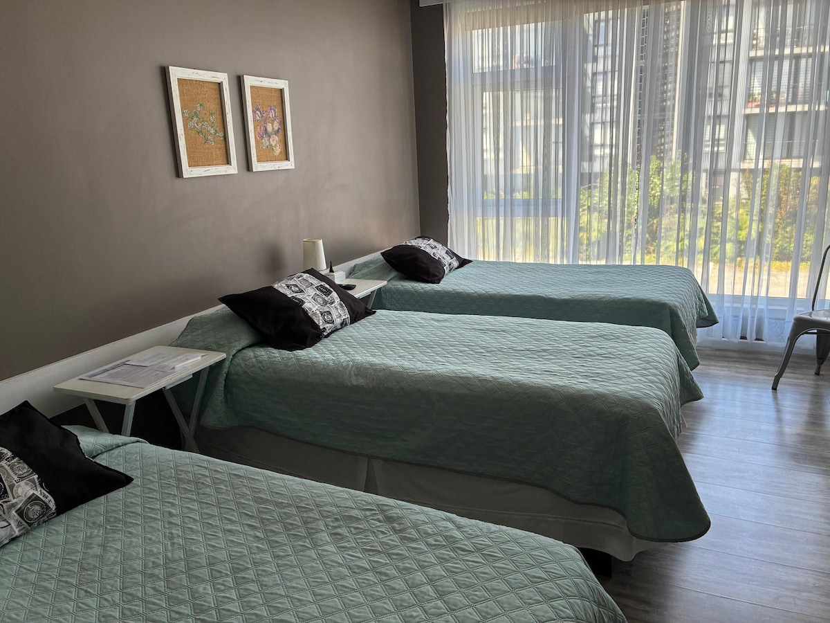 Habitacion familiar triple en hostal ubicado en llanquihue, en un tranquilo barrio residencial, a unos 50 metros del lago llanquihue y su costanera. A 12 min caminando de la estación de trenes