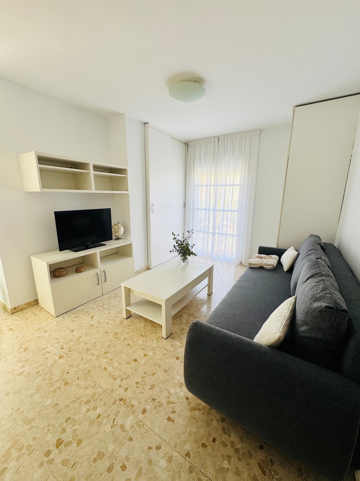 El piso tiene 35 mts, está totalmente amueblado y dividido en dos estancias. Un dormitorio con una confortable cama (Queen 150x190), Smart TV. La sala de estar con un sofá clic-clac. WiFi de alta velocidad. Las ventanas dan al patio interior, por lo que eventualmente puede escuchar entrar a algún vecino. Split frio/calor. Impecable baño privado con ducha, bidet y secador de pelo. Se facilitan toallas y ropa de cama. A 200 mts del centro histórico y unos 2km de la playa. (25 min a pie)