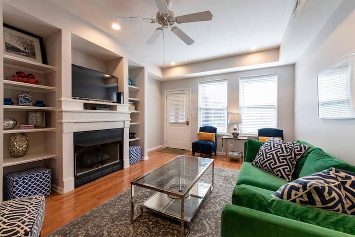 Immerse yourself in the charm and comfort of this modern apartment. This spacious 1,510 sqft retreat offers a blend of style and convenience, featuring 2 bedrooms equipped with plush bedding and en-suite bathrooms. Revive your spirit in a fully equipped kitchen, relax in the family room by the smart TV and fireplace, or unwind under the ceiling fans after a day of exploring Louisville's attractions. Ideal for families and groups, this centrally located apartment promises a delightful stay!