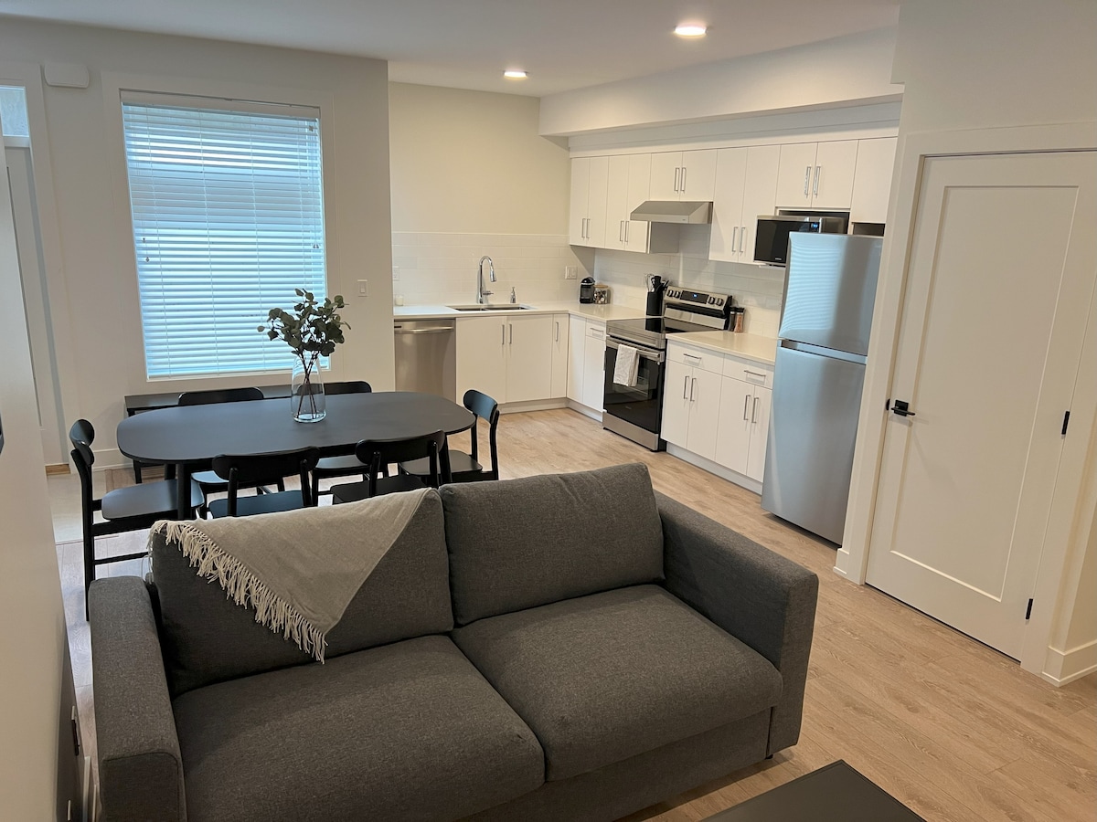 ¡Disfruta de una experiencia elegante en este alojamiento céntrico en un barrio seguro y bonito! - Cerca de tiendas, océano, montañas y estación de Seabus (10-15 minutos a pie). - Cerca del transporte. - Estacionamiento gratuito en la calle disponible. - Esta unidad de apartamento de soltero ofrece 1 cómoda cama doble y 1 baño completo de gran tamaño. - Cocina de tamaño completo con magnífica encimera de mármol y electrodomésticos nuevos; un refrigerador elegante de tamaño completo, microondas y horno.