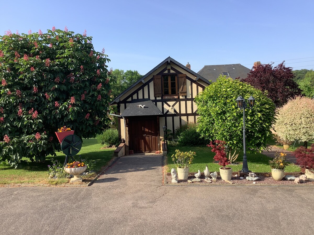 Habitación independiente en el campo en una antigua granja reformada ( situada en una dependencia de la propiedad) El alojamiento consta de: En la planta de arriba: Habitación Cuarto de baño con inodoro Salón En la planta baja: Cuartito para desayunar Aparcamiento cerrado Café y té incluidos Cerca de varios lugares de interés (castillo de Tilly, Honfleur, etc.)