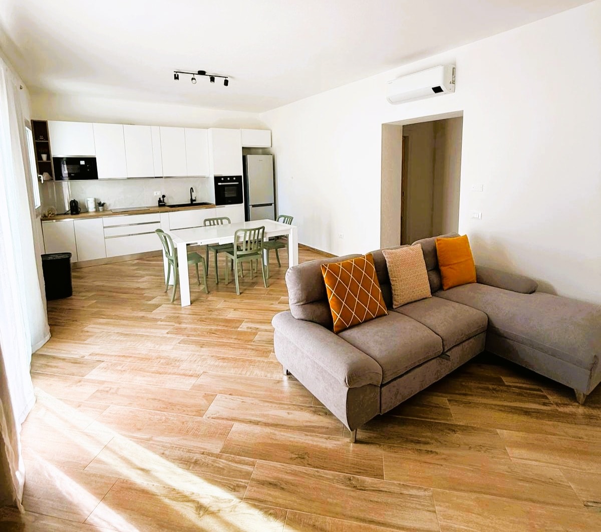 Maravilloso piso para 6 personas en la planta baja, a sólo 150 m de la hermosa playa. El piso consta de cocina americana, salón con sofá cama, dormitorio doble, dormitorio con 2 camas, baño, terraza, jardín privado (3 televisores). Amplio aparcamiento público. La cocina está muy bien equipada. Aire acondicionado y bomba de calor . En el cuarto de baño, que tiene ducha, también hay secador de pelo, plancha y lavadora.