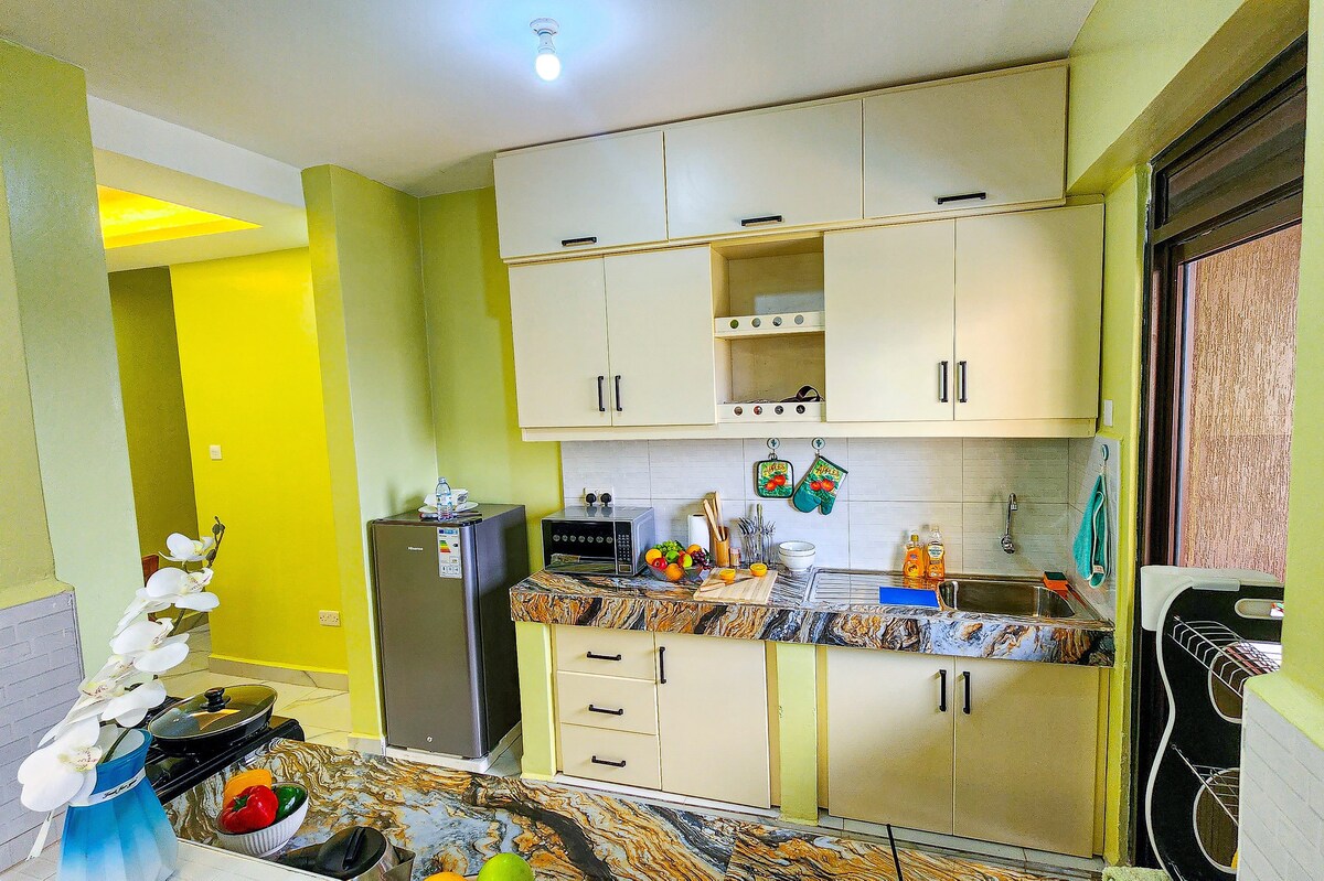 Descubre nuestro apartamento de un dormitorio en el centro de Bukoto. Asegurándonos de que cada momento de tu estancia esté envuelto en lujo y calidez. Disfruta de la cautivadora vista mientras el día se acaba en nuestro acogedor balcón. El alojamiento El apartamento cuenta con un dormitorio con calentador de agua, cocina totalmente equipada, wifi, TV inteligente con YouTube y Netflix, lavadora, piscina, gimnasio y un patio con vistas al atardecer. Cerca de la carretera de circunvalación del norte, a solo 4,8 km del centro comercial Acacia y a 6 km del centro de Kampala.