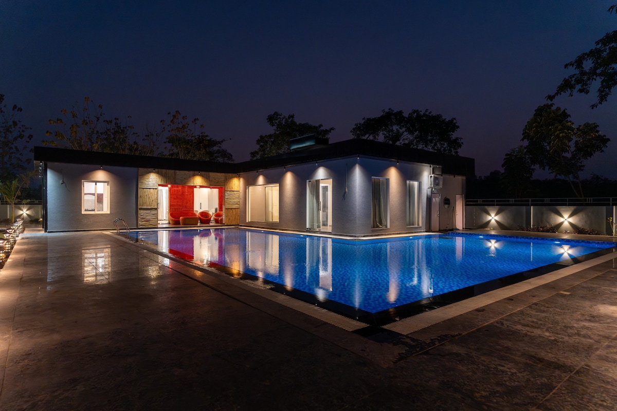 Disfruta de una estancia de lujo en esta propiedad privada de 1100 pies cuadrados con un amplio dormitorio de 400 pies cuadrados, una piscina adjunta totalmente privada (3 pies de profundidad) y un cine en casa de 200 pulgadas con canales OTT y TV. La suite incluye una cocina totalmente funcional, un baño grande, Internet de alta velocidad, agua RO y un sistema de música en todo el alojamiento. Las luces de DJ y la máquina de humo crean un ambiente de fiesta perfecto. Apto para parejas, check-in autónomo, zona segura, estacionamiento disponible. Se permiten fiestas para un máximo de 5–6 huéspedes.