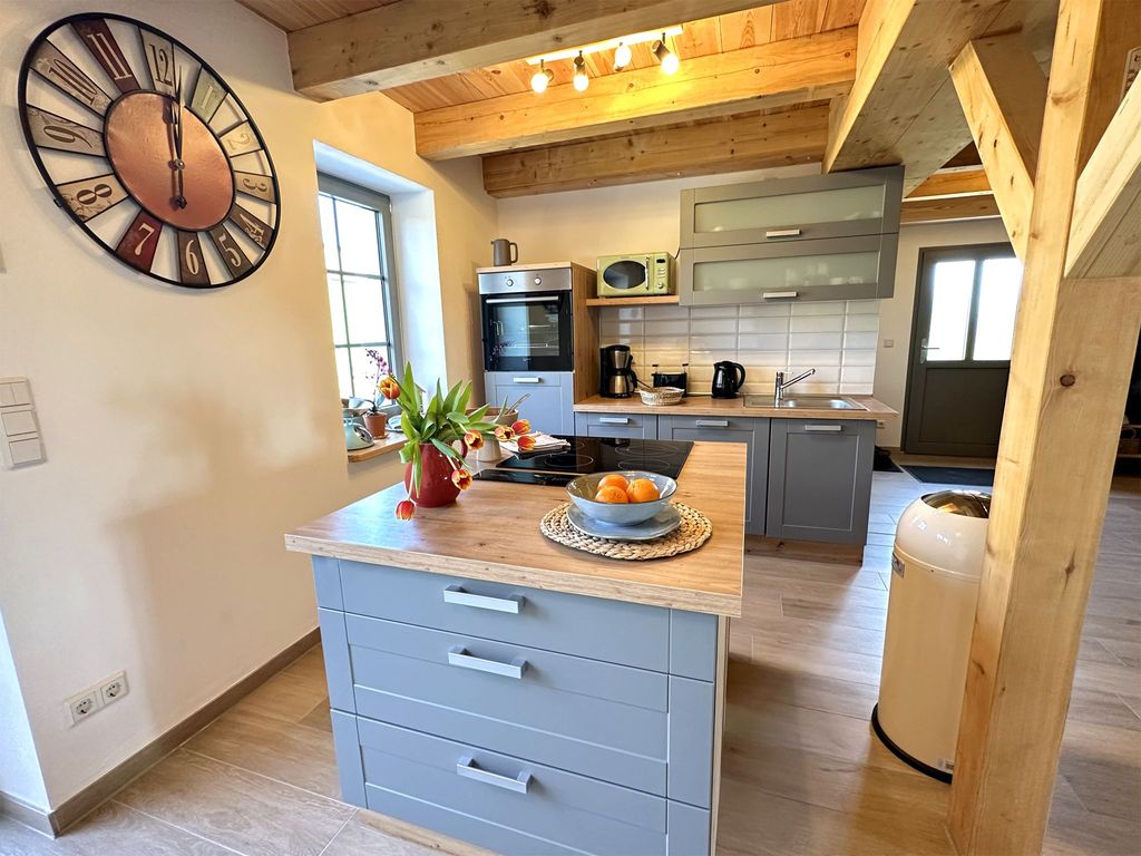Incluye el uso gratuito de botes de remos en Rieth. Hemos reinterpretado los elementos históricos de la casa. Al exponer las vigas de entramado originales en el interior, se ha creado una sala de estar amplia y espaciosa con una galería. La robusta chimenea de ladrillo se alza como un monolito en la habitación. Los clásicos muebles de los años 70 se han trasladado a las claras tablas de madera, la cocina de diseño con bloque de cocción abierto y la estufa crepitante completan la atmósfera de bienestar.