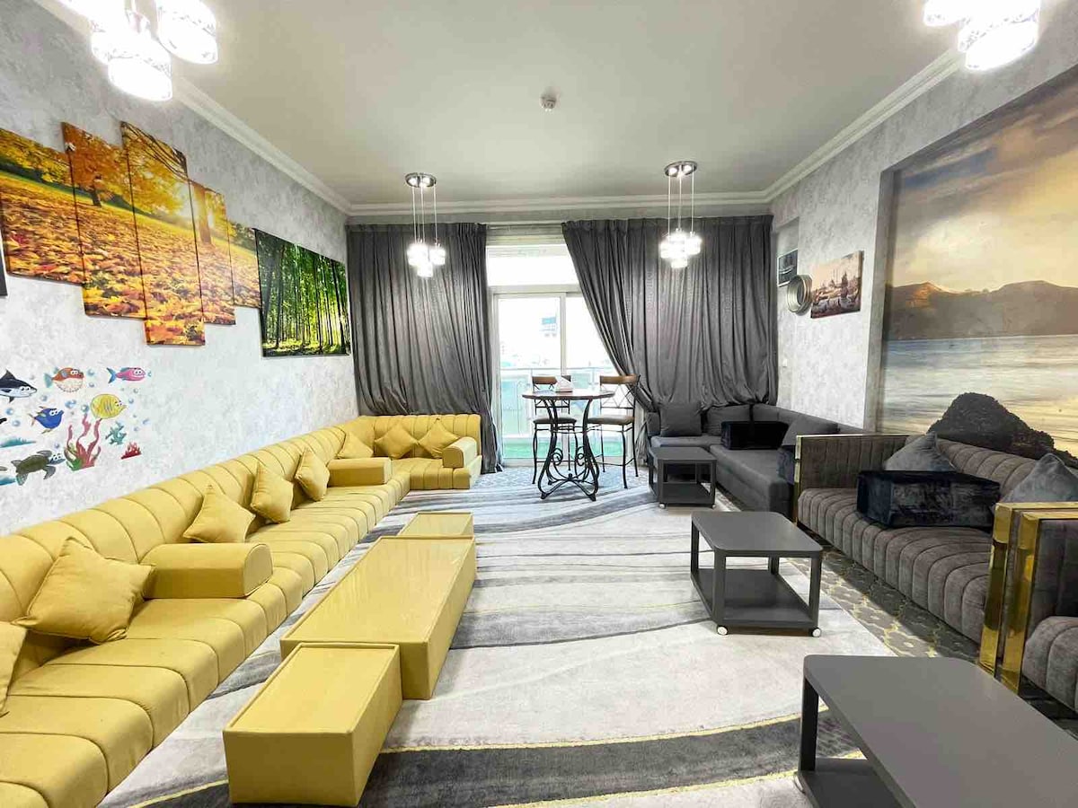 Enjoy your stay at our bright Two-bedroom luxurious apartment in heart of the pearl ,is centrally located to many restaurants, cafe shops ,shopping, and nightlife with sea view , Wonderful location to spend time with family, friends, or business. Amenities include access to Private Beach ,Free Parking, High-Speed WiFi, Fully equipped kitchen- Washer and dryer. gym, swimming Pool and kids Play area ,Marina walk A reception service is available for any assistance, free Luggage service