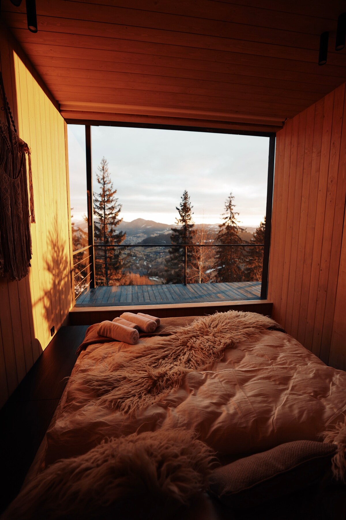 Te invitamos a relajarte en una lujosa casa de campo en las montañas con ventanas panorámicas que ofrecen una vista magnífica. Hay un jacuzzi, spa, chimenea y una terraza con barbacoa para las noches al aire libre. Para crear un ambiente especial, un tocadiscos de vinilo y un proyector para películas. Es un lugar ideal para relajarse, rodeado de naturaleza, comodidad y elegancia con seres queridos o amigos.