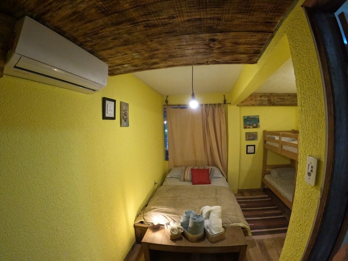 🍀Suite Gratitude🙏: pareja o hasta 5 personas ✅1 cama matrimonial ✅1 treliche ✅Desayuno incluido ✅Televisión de 32 pulgadas ✅° Minibar; ✅Aire acondicionado/ventilador ✅Ropa de cama y toallas ✅Baño privado
