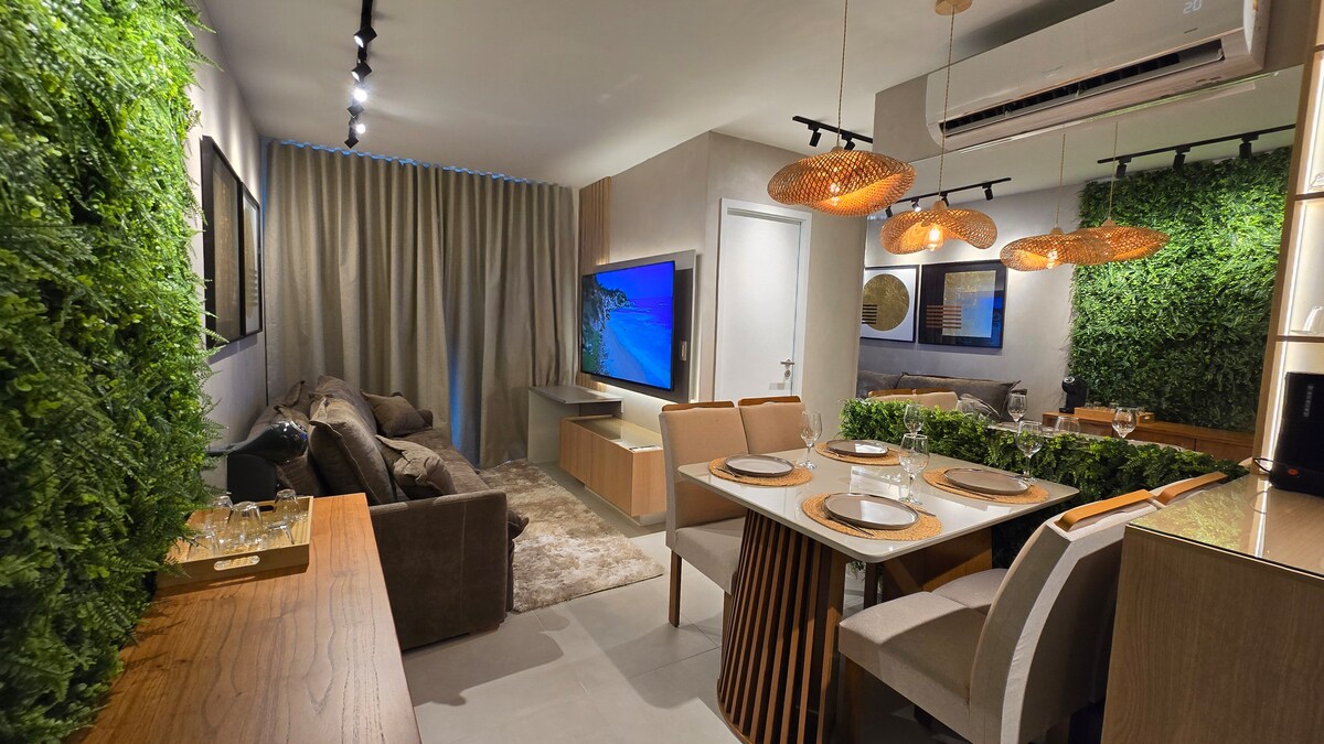 "Apartamento nuevo, recién reformado, con decoración moderna, situado en el corazón de Ponta Verde, Pajuçara, Ferinha do artesanato y Jatíuca, las mejores playas de Maceió, a 5 minutos del apartamento las playas antes mencionadas, apartamento con un área útil de 50 metros - sala integrada con la cocina, 1 dormitorio (suite) con baño integrado- Aire acondicionado de 9.000 BTu. Internet- Wi-fi - Netflix, Ropa de cama y toalla de baño, utensilios completos, cocina, vasos, tazas, nevera, cafetera, 2 TV. Conserje 24 horas.
