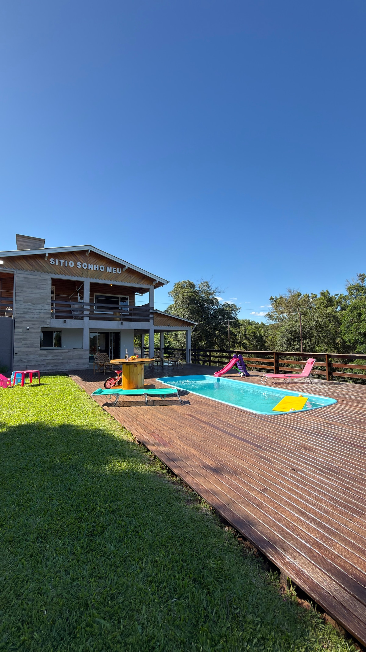 Apartamentos Piratuba: disfruta de una estancia única en nuestra espaciosa casa con piscina privada y una impresionante vista del lago Machadinho Plant. Sitio Sonho Meu tiene 3 dormitorios, 2 baños, perfecto para familias y grupos de amigos Dos amplios balcones con 2 barbacoas y pinchos, TV en la sala de estar (streaming), wifi, comedor, cocina con estufa de leña, todo integrado Sumérgete en la piscina mientras disfrutas de las vistas de la naturaleza alrededor de la propiedad con privacidad y comodidad