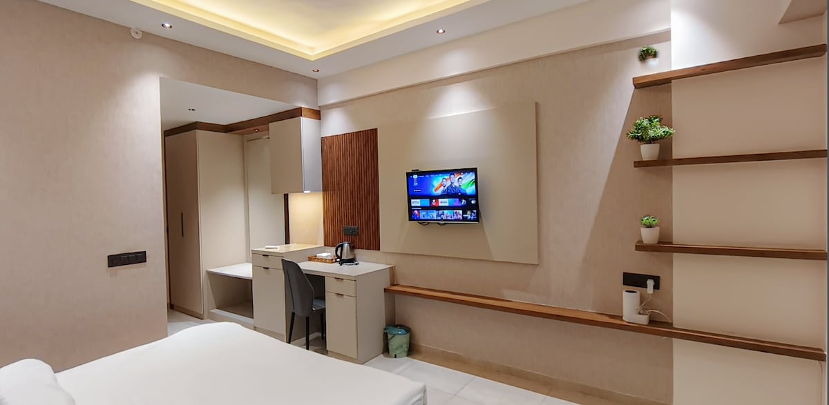 Un acogedor e independiente apartamento de 2 dormitorios ubicado en el último piso (9º), que ofrece un ambiente hogareño para tu estancia. El apartamento cuenta con 2 amplios dormitorios, cada uno equipado con aire acondicionado para garantizar tu comodidad. Hay 2 baños limpios y bien mantenidos, que se limpiarán a fondo antes de tu llegada. Hay una cocina totalmente funcional disponible, lo que te permite cocinar tus propias comidas. También se proporciona una lavadora para tu comodidad. Disfruta de acceso a 13 plataformas OTT, incluidas Hotstar y SonyLIV.