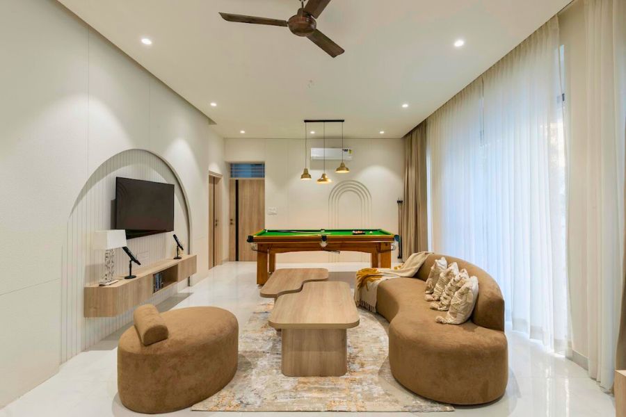 Ubicado en un tranquilo barrio residencial de Jagatpura, Aarrunya es una opción perfecta para estancias familiares, lunas de miel acogedoras, vacaciones relajantes con amigos y retiros contemplativos en solitario. Su diseño rústico moderno se evidencia en las paredes de ladrillo visto y las grandes ventanas orientadas al este, que inundan la casa de una brillante luz natural. En el fragante césped, las mariposas blancas de la col revuelan entre los cerezos recién plantados y se puede escuchar el alegre canto de los pájaros durante todo el día.