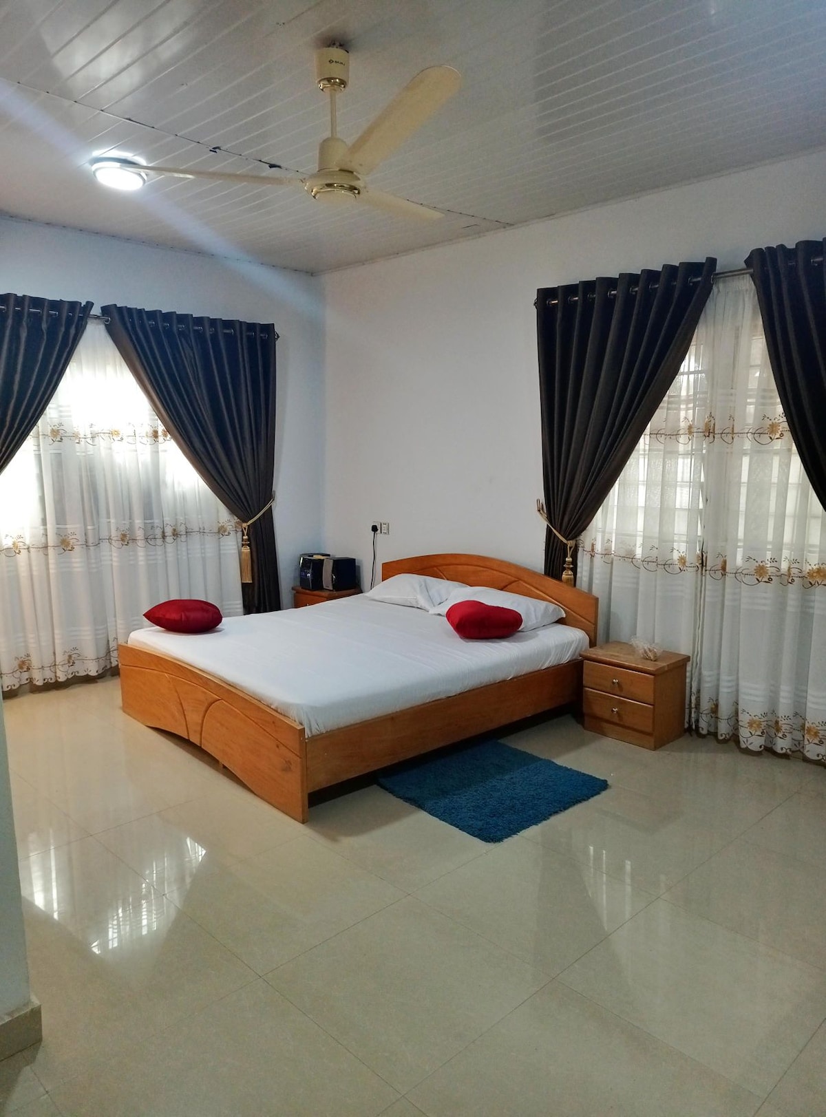 Sencillo en este lugar tranquilo y céntrico en la carretera de Spintex. Espacio muy acogedor, a unos 15 minutos del aeropuerto, a 10 minutos de Tema y muy cerca de centros comerciales y centros de vida nocturna. Hay un generador de reserva en casos de corte de energía. También hay Netflix gratis. Los huéspedes también tienen acceso a una mesa de billar para su entretenimiento. Hay un limpiador y el lugar tiene seguridad las 24 horas del día, los 7 días de la semana.