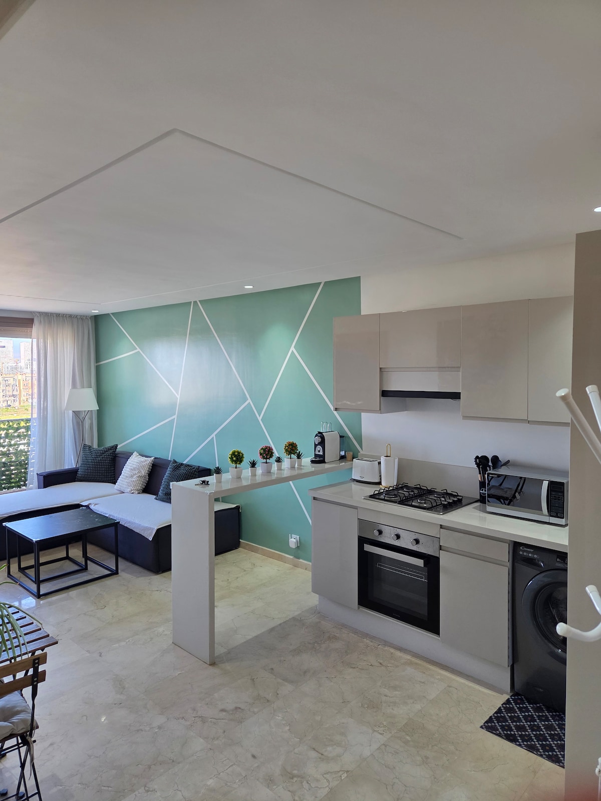 • ¡Bienvenido a Linaz Living, en Oasis Casablanca! Moderno 🔹estudio con 1 dormitorio, luminosa sala de estar, cocina americana equipada, baño italiano y terraza. 🔹Situado en la planta baja con estacionamiento subterráneo. 🔹2 minutos a la estación de tren Oasis y Maarif. A 🔹2 minutos de los hospitales y todas las tiendas. 🔹5 minutos a la mezquita Hassan 2 - Marina shoping - Saqala - Dar Dada • Comodidad, tranquilidad y ubicación ideal para viajeros, turistas o profesionales.